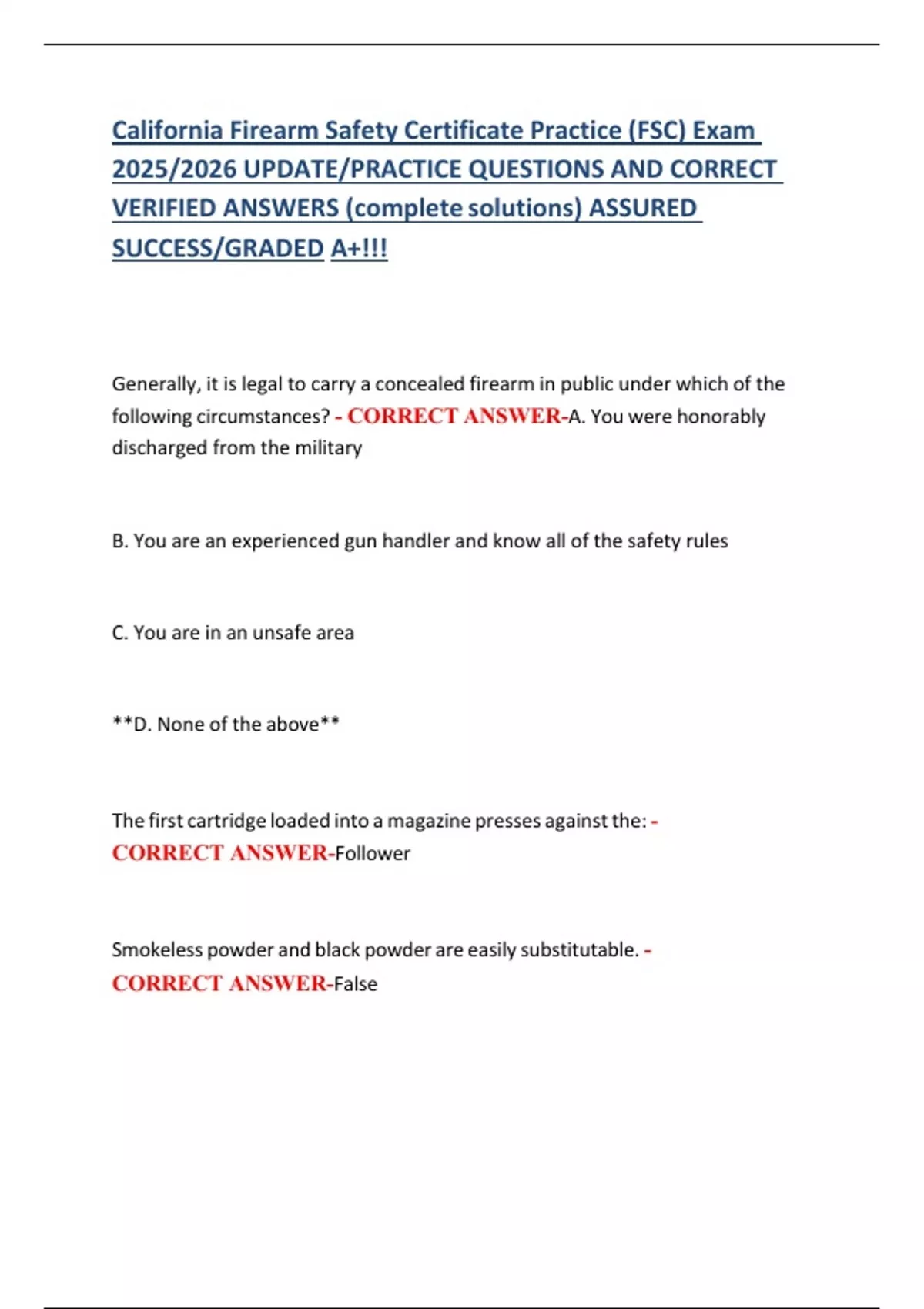 California Firearm Safety Certificate Practice (FSC) Exam 2025/2026 UPDATE/PRACTICE QUESTIONS AND CORRECT VERIFIED ANSWERS (complete solutions) ASSURED SUCCESS/GRADED A+!!! Generally, it is legal to carry a concealed firearm in public under which of the following circumstances? - CORRECT ANSWER-A. You were honorably discharged from the military B. You are an experienced gun handler and know all of the safety rules C. You are in an unsafe area **D. None of the above** The first cartridge loaded into a magazine presses against the: - CORRECT ANSWER-Follower Smokeless powder and black powder are easily substitutable. - CORRECT ANSWER-False