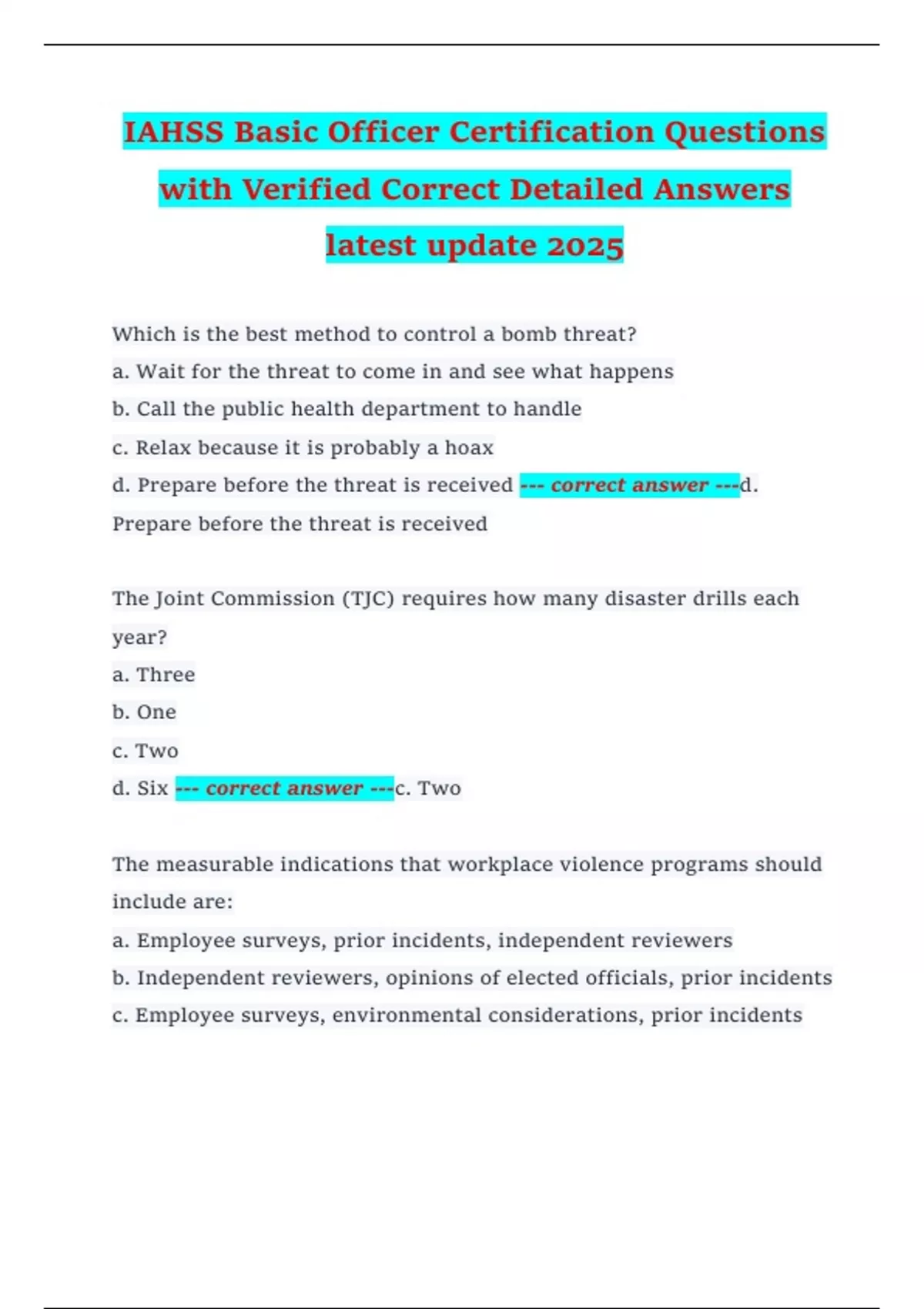 IAHSS Basic Officer Certification Questions with Verified Correct Detailed Answers latest update 2025 Which is the best method to control a bomb threat? a. Wait for the threat to come in and see what happens b. Call the public health department to handle c. Relax because it is probably a hoax d. Prepare before the threat is received --- correct answer ---d. Prepare before the threat is received The Joint Commission (TJC) requires how many disaster drills each year? a. Three b. One c. Two d. Six --- correct answer ---c. Two The measurable indications that workplace violence programs should include are: a. Employee surveys, prior incidents, independent reviewers b. Independent reviewers, opinions of elected officials, prior incidents c. Employee surveys, environmental considerations, prior incidents d. Employee surveys, independent reviewers, engineering input --- correct answer ---a. Employee surveys, prior incidents, independent reviewers