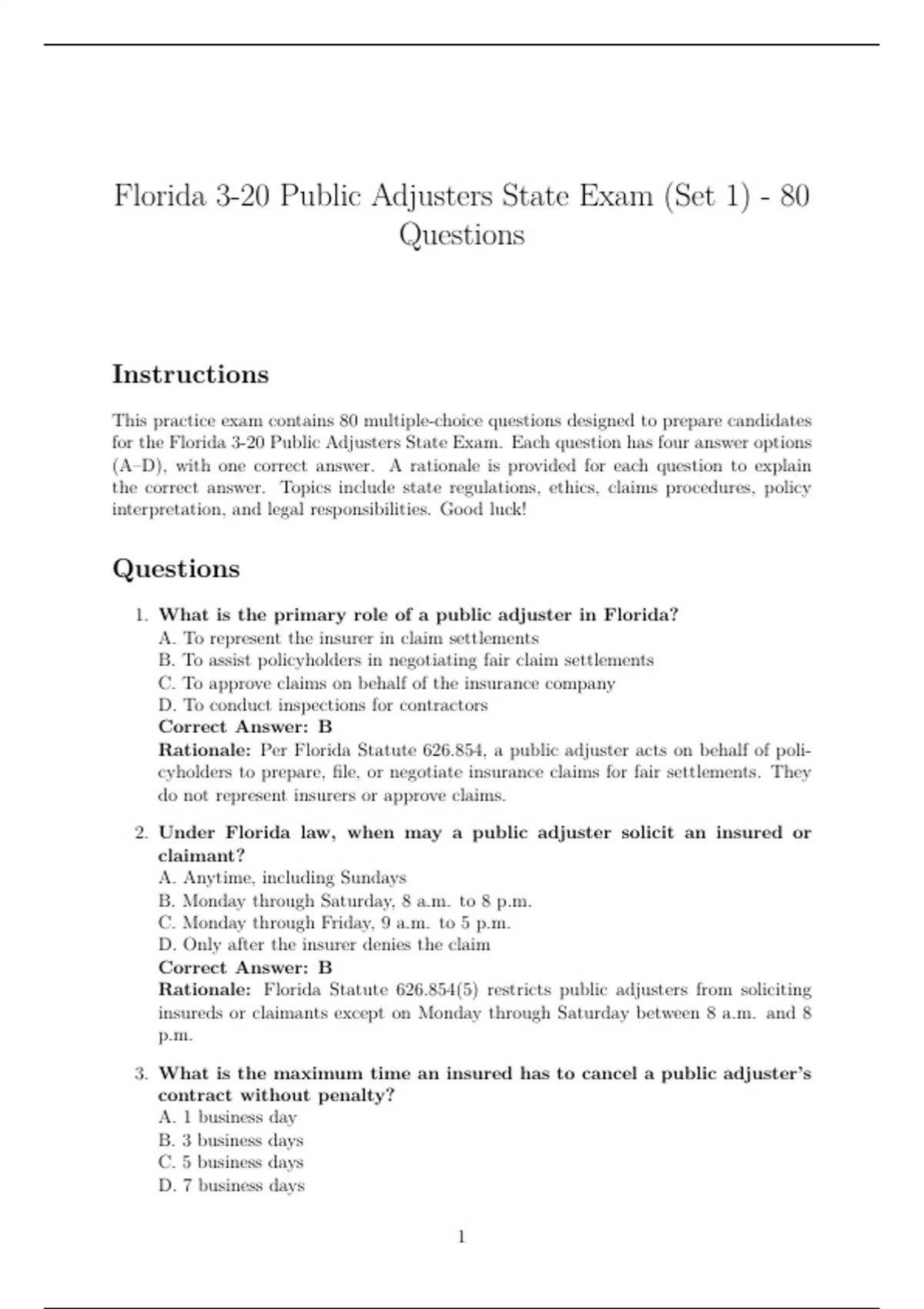 for the Florida 3-20 Public Adjusters State Exam. Each question has four answer options