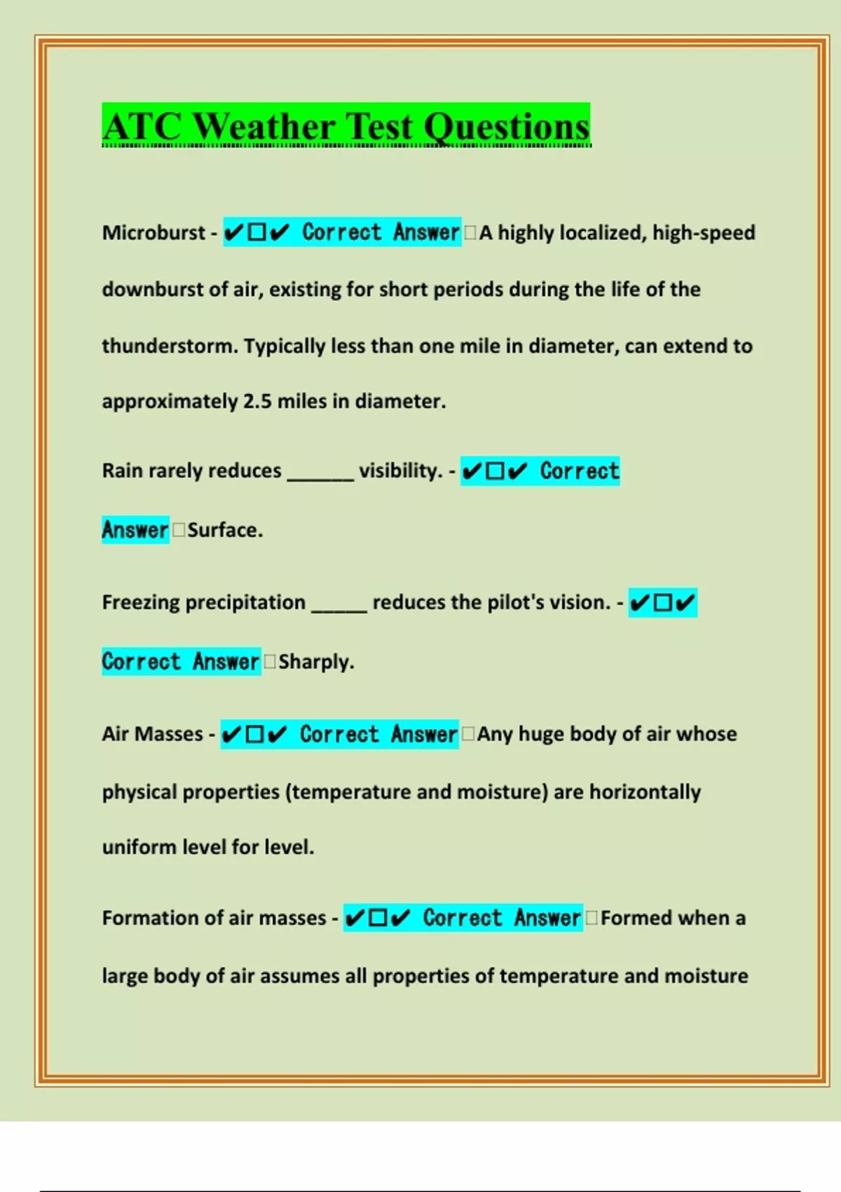 Microburst - ️ Correct Answer A highly localized, high-speed downburst of air, existing for short periods during the life of the thunderstorm. Typically less than one mile in diameter, can extend to approximately 2.5 miles in diameter. Rain rarely reduces ______ visibility. - ️ Correct Answer Surface. Freezing precipitation _____ reduces the pilot's vision. - ️ Correct Answer Sharply. Air Masses - ️ Correct Answer Any huge body of air whose physical properties (temperature and moisture) are horizontally uniform level for level. Formation of air masses - ️ Correct Answer Formed when a large body of air assumes all properties of temperature and moisturewhile resting over its "source region." Best source regions are the large snow and ice covered polar regions, cold northern oceans, tropical oceans, and large desert areas.