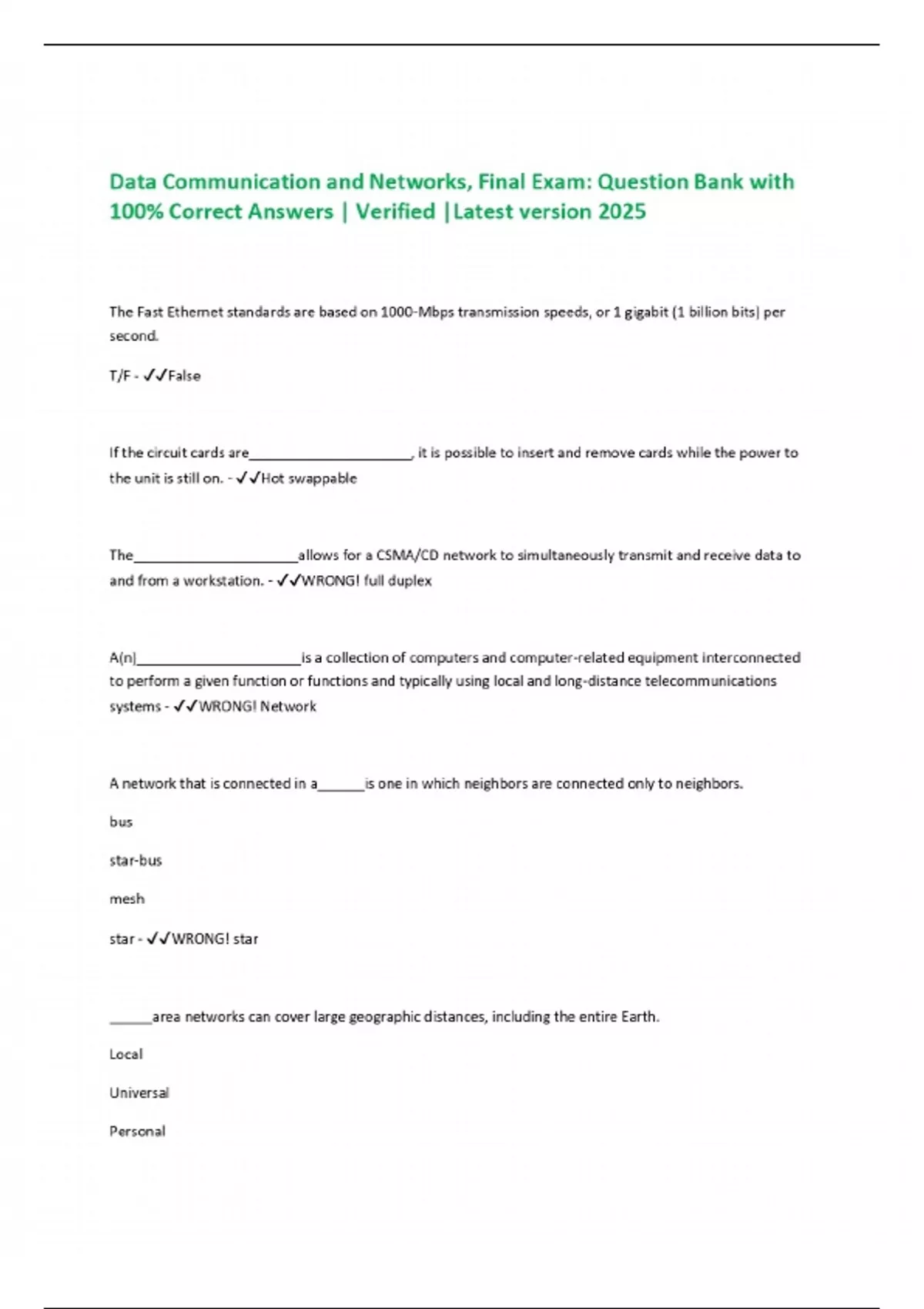 Data Communication and Networks, Final Exam: Question Bank with 100% Correct Answers | Verified |Latest version 2025