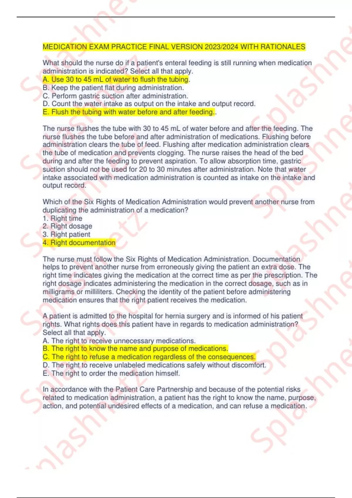 MEDICATION EXAM PRACTICE FINAL VERSION 2023/2024 WITH RATIONALES