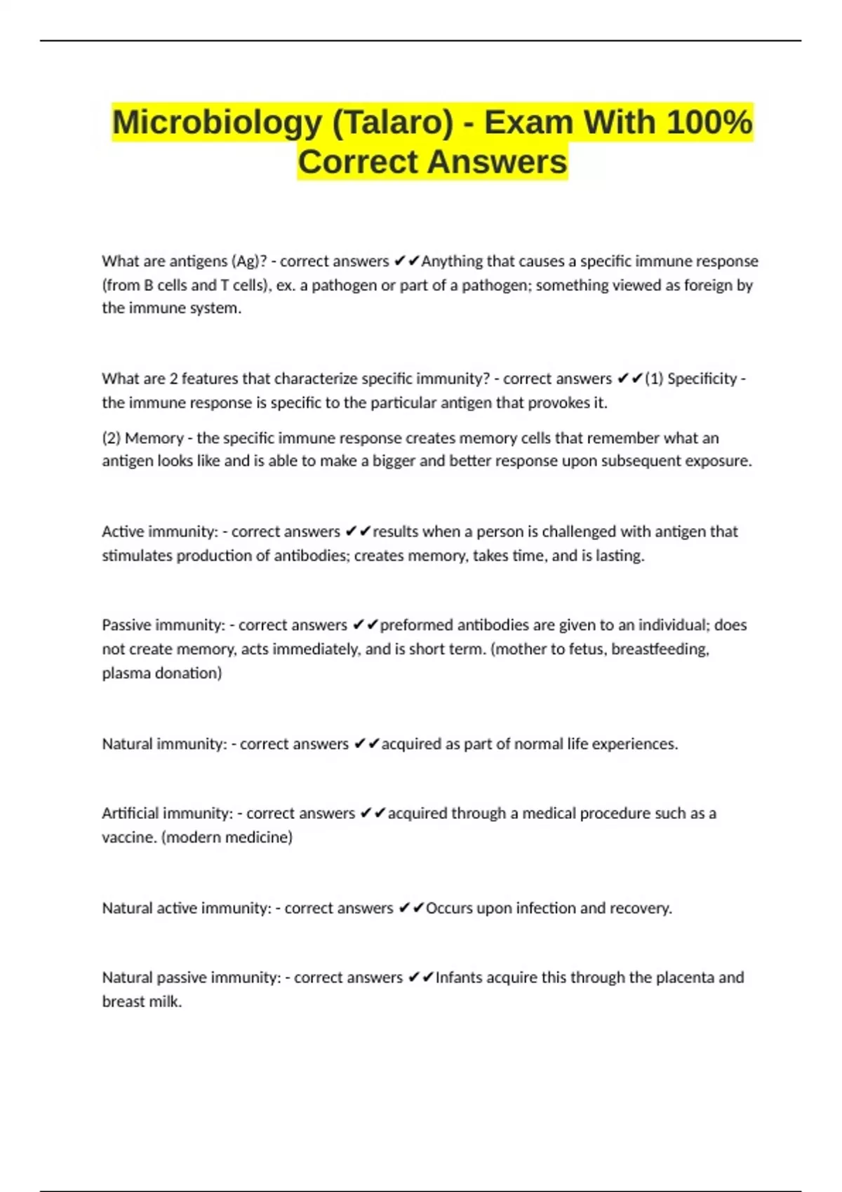 What are antigens (Ag)? - correct answers Anything that causes a specific immune response (from B cells and T cells), ex. a pathogen or part of a pathogen; something viewed as foreign by the immune system. What are 2 features that characterize specific immunity? - correct answers (1) Specificity - the immune response is specific to the particular antigen that provokes it. (2) Memory - the specific immune response creates memory cells that remember what an antigen looks like and is able to make a bigger and better response upon subsequent exposure. Active immunity: - correct answers results when a person is challenged with antigen that stimulates production of antibodies; creates memory, takes time, and is lasting. Passive immunity: - correct answers preformed antibodies are given to an individual; does not create memory, acts immediately, and is short term. (mother to fetus, breastfeeding, plasma donation) Natural immunity: - correct answers acquired as part of normal life experiences. Artificial immunity: - correct answers acquired through a medical procedure such as a vaccine. (modern medicine) Natural active immunity: - correct answers Occurs upon infection and recovery.