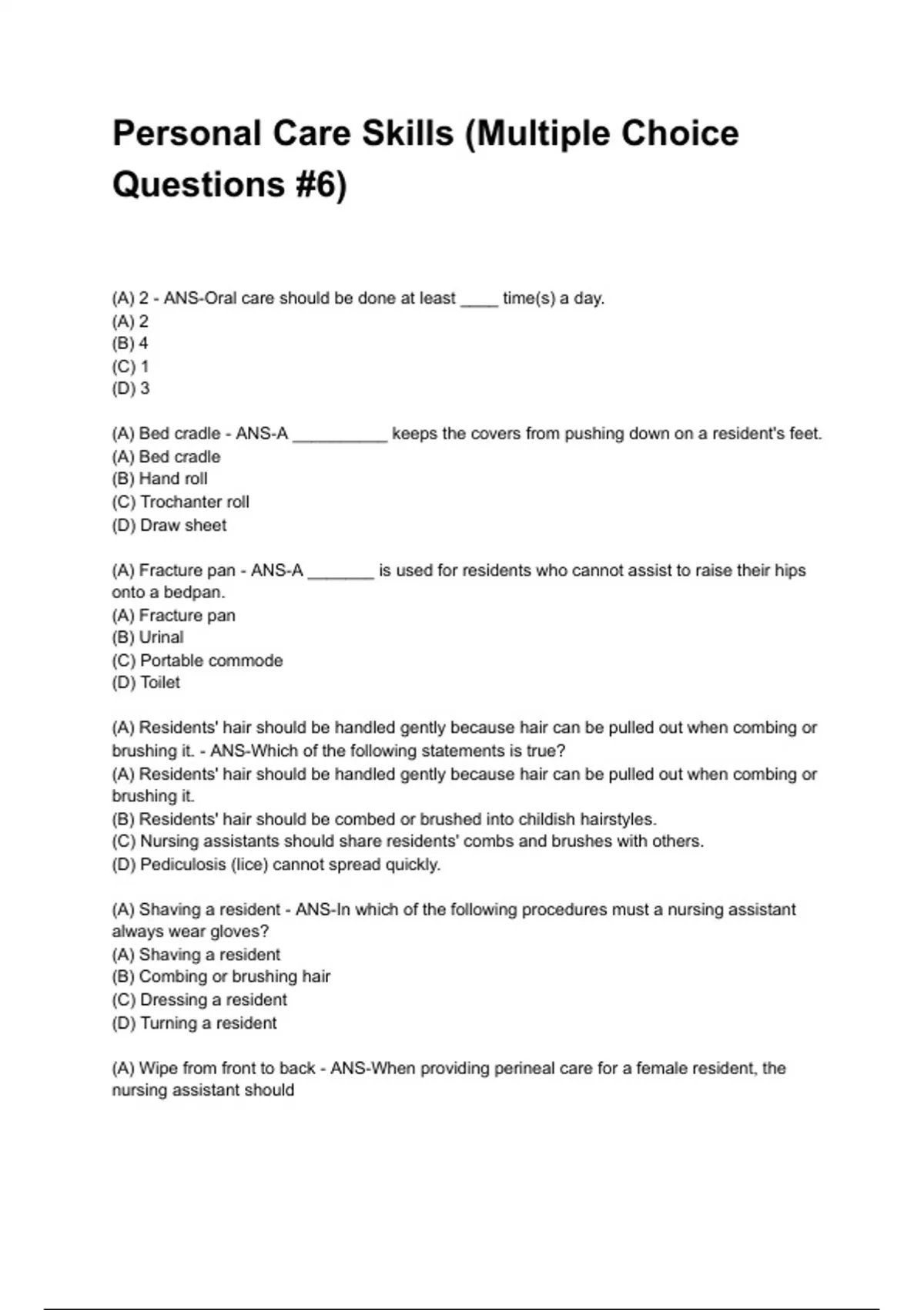 (A) Wipe from front to back - ANS-When providing perineal care for a female resident, the