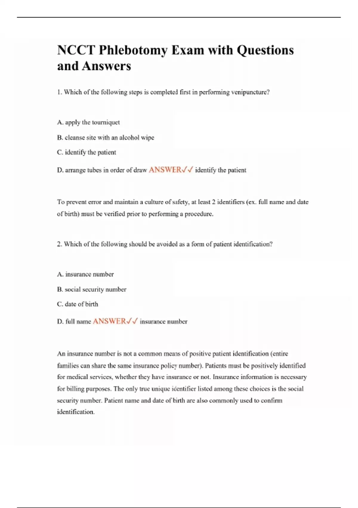 NCCT Phlebotomy Exam with Questions and Answers 1. Which of the following steps is completed first in performing venipuncture? A. apply the tourniquet B. cleanse site with an alcohol wipe C. identify the patient D. arrange tubes in order of draw ANSWER identify the patient To prevent error and maintain a culture of safety, at least 2 identifiers (ex. full name and date of birth) must be verified prior to performing a procedure. 2. Which of the following should be avoided as a form of patient identification? A. insurance number B. social security number C. date of birth D. full name ANSWER insurance number An insurance number is not a common means of positive patient identification (entire families can share the same insurance policy number). Patients must be positively identified for medical services, whether they have insurance or not. Insurance information is necessary for billing purposes. The only true unique identifier listed among these choices is the social security number. Patient name and date of birth are also commonly used to confirm identification.