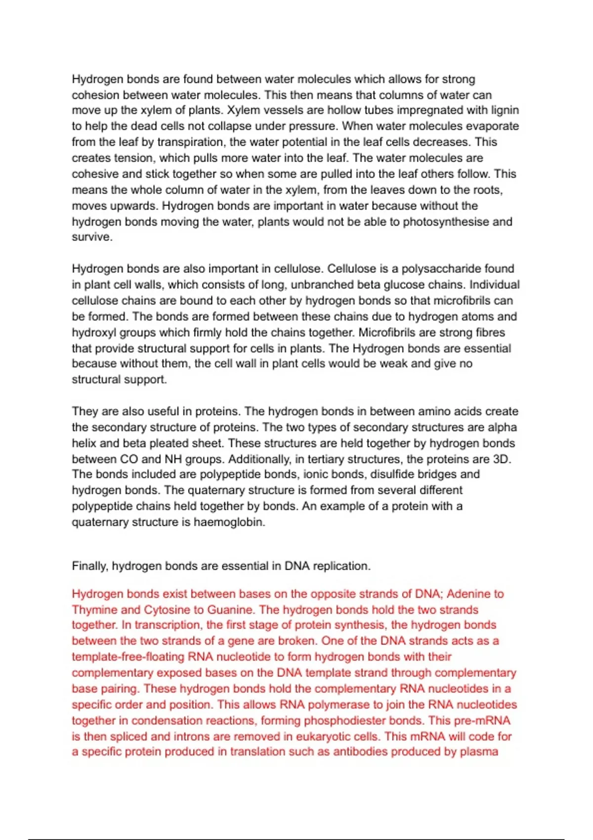 This document provides a detailed essay discussing the importance of hydrogen bonds in various biological processes, suitable for exam preparation. It explains the role of hydrogen bonds in water transport via xylem, cellulose structure in plant cell walls, protein secondary, tertiary, and quaternary structures, and DNA replication and transcription. The essay includes clear examples such as haemoglobin and the formation of mRNA during protein synthesis.
