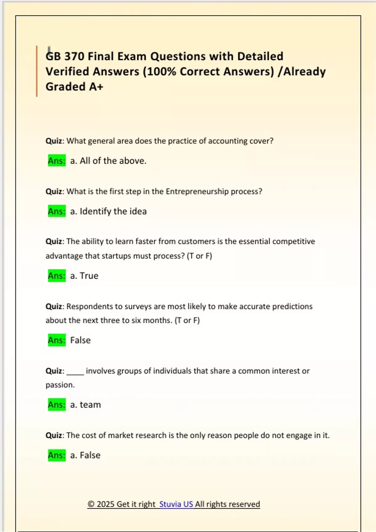 GB 370 Final Exam Questions with Detailed Verified Answers (100% Correct Answers) /Already Graded A+ GB 370 Final Exam Questions with Detailed Verified Answers (100% Correct Answers) /Already Graded A+