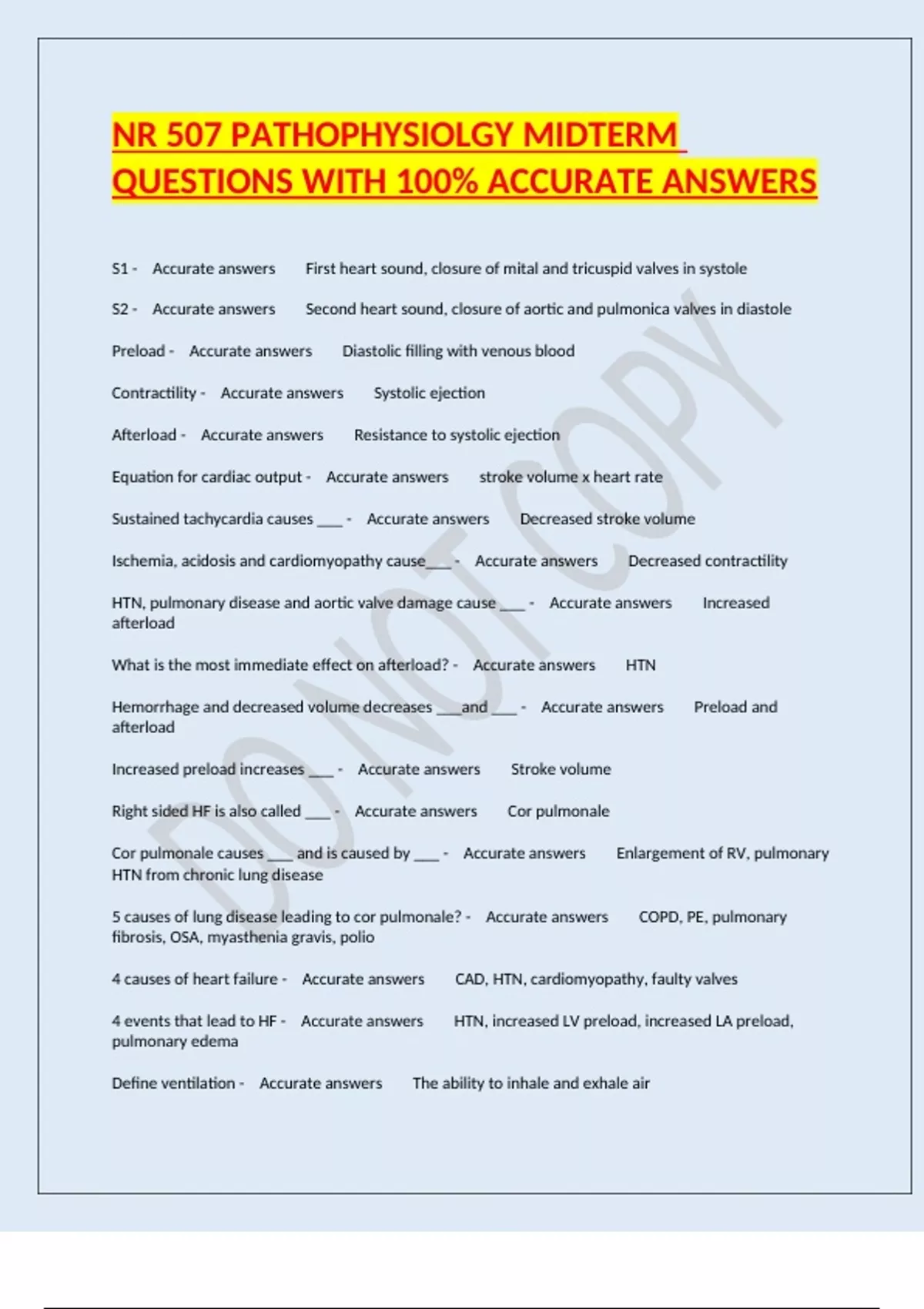 Afterload - Accurate answers Resistance to systolic ejection
