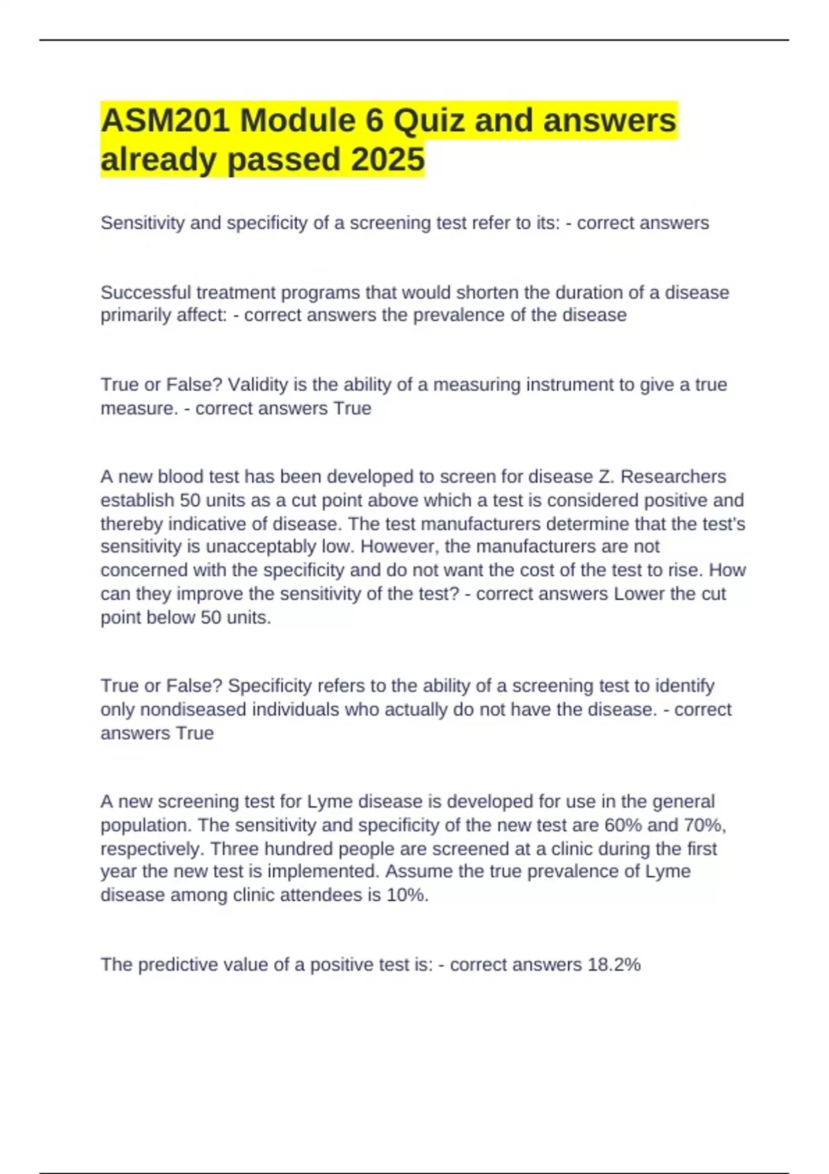 ASM201 Module 6 Quiz and answers already passed 2025 Sensitivity and specificity of a screening test refer to its: - correct answers Successful treatment programs that would shorten the duration of a disease primarily affect: - correct answers the prevalence of the disease True or False? Validity is the ability of a measuring instrument to give a true measure. - correct answers True