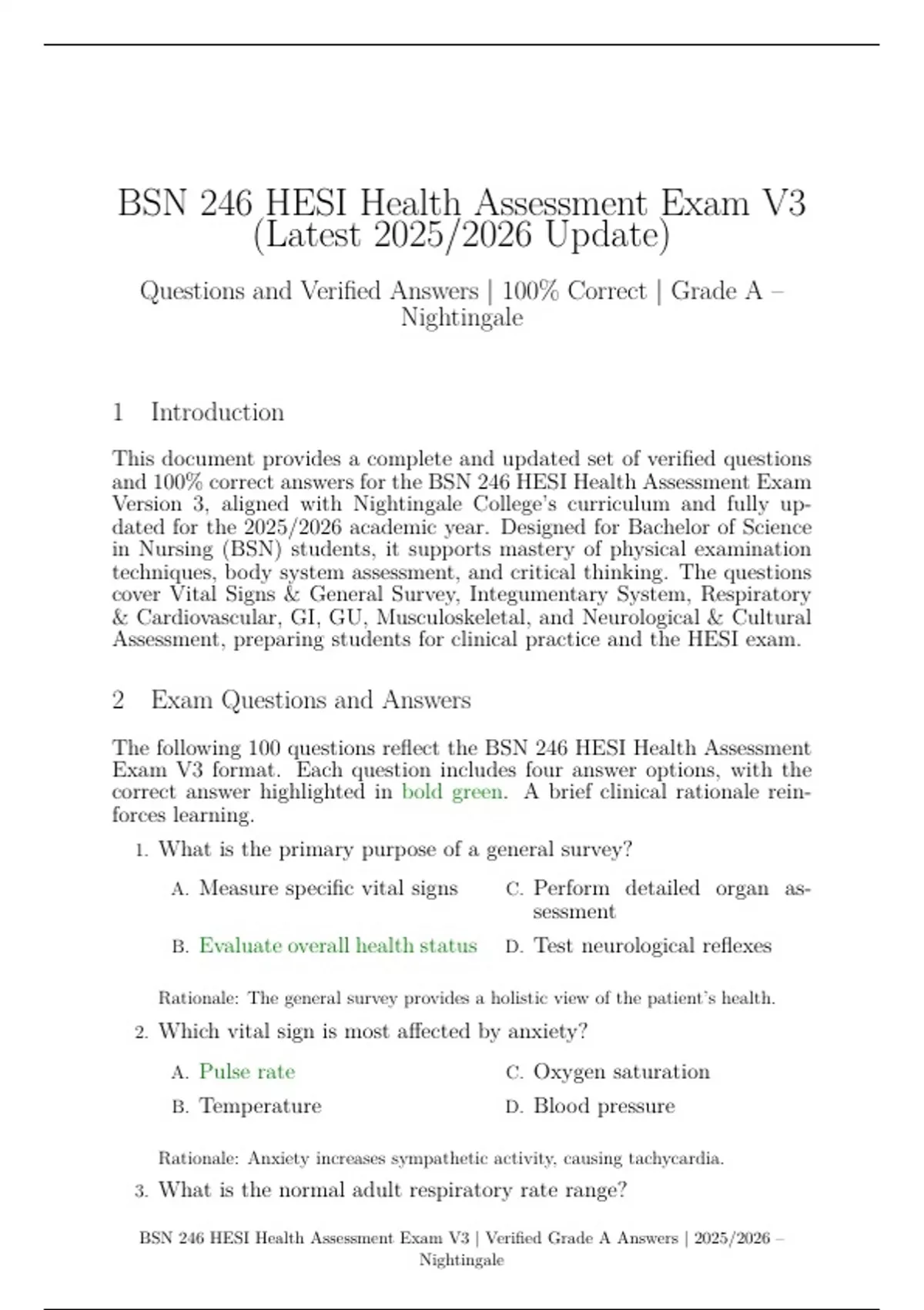 BSN 246 HESI Health Assessment Exam V3 | Verified Grade A Answers | 2025/2026 –