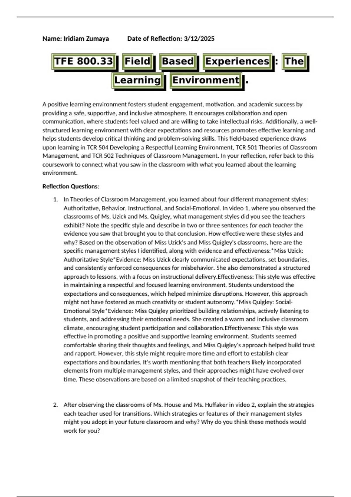 Management, and TCR 502 Techniques of Classroom Management. In your reflection, refer back to this