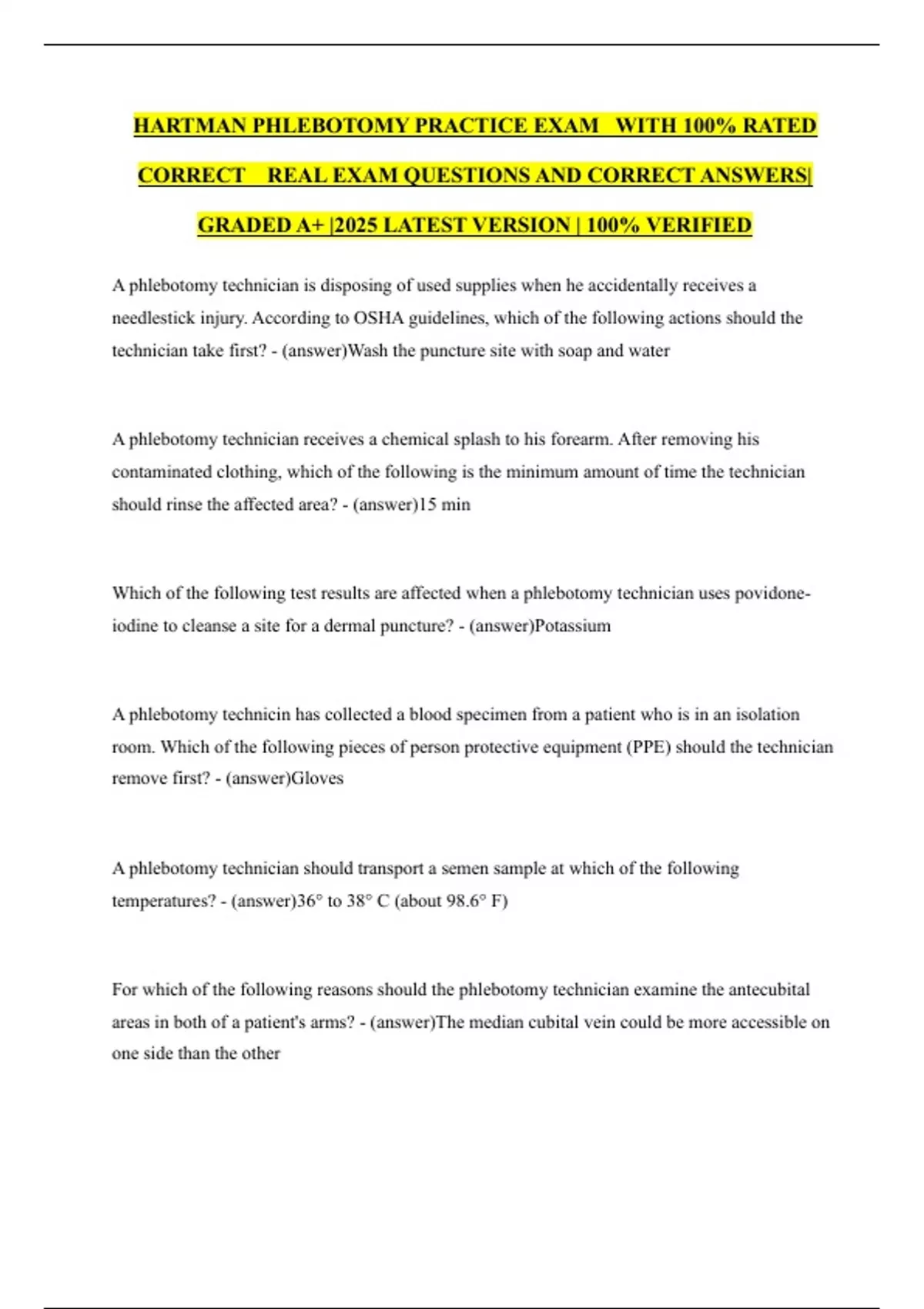 HARTMAN PHLEBOTOMY PRACTICE EXAM WITH 100% RATED CORRECT REAL EXAM QUESTIONS AND CORRECT ANSWERS| GRADED A+ |2025 LATEST VERSION | 100% VERIFIED