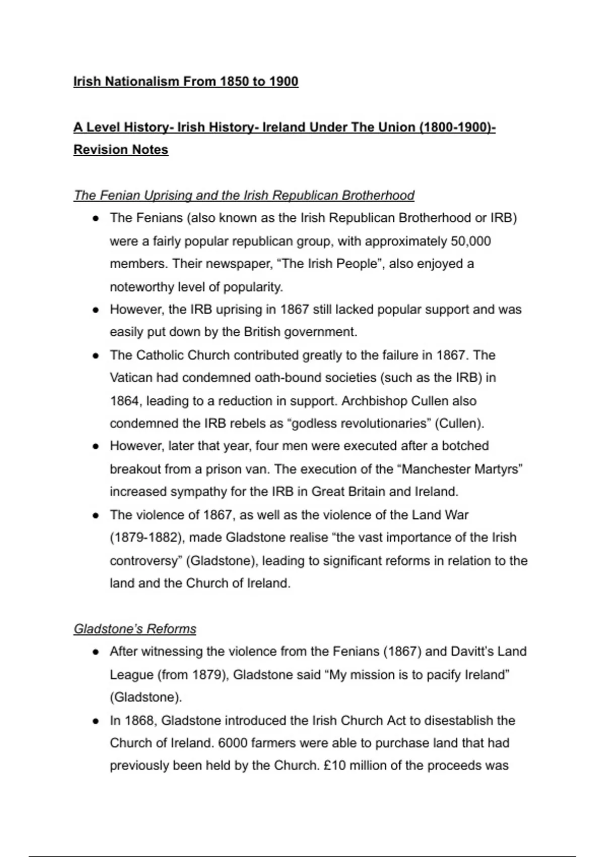 This is a summary of Irish nationalism from 1850 to 1900, which I used to study for the "Ireland Under The Union" section of A Level History. Happy studying!