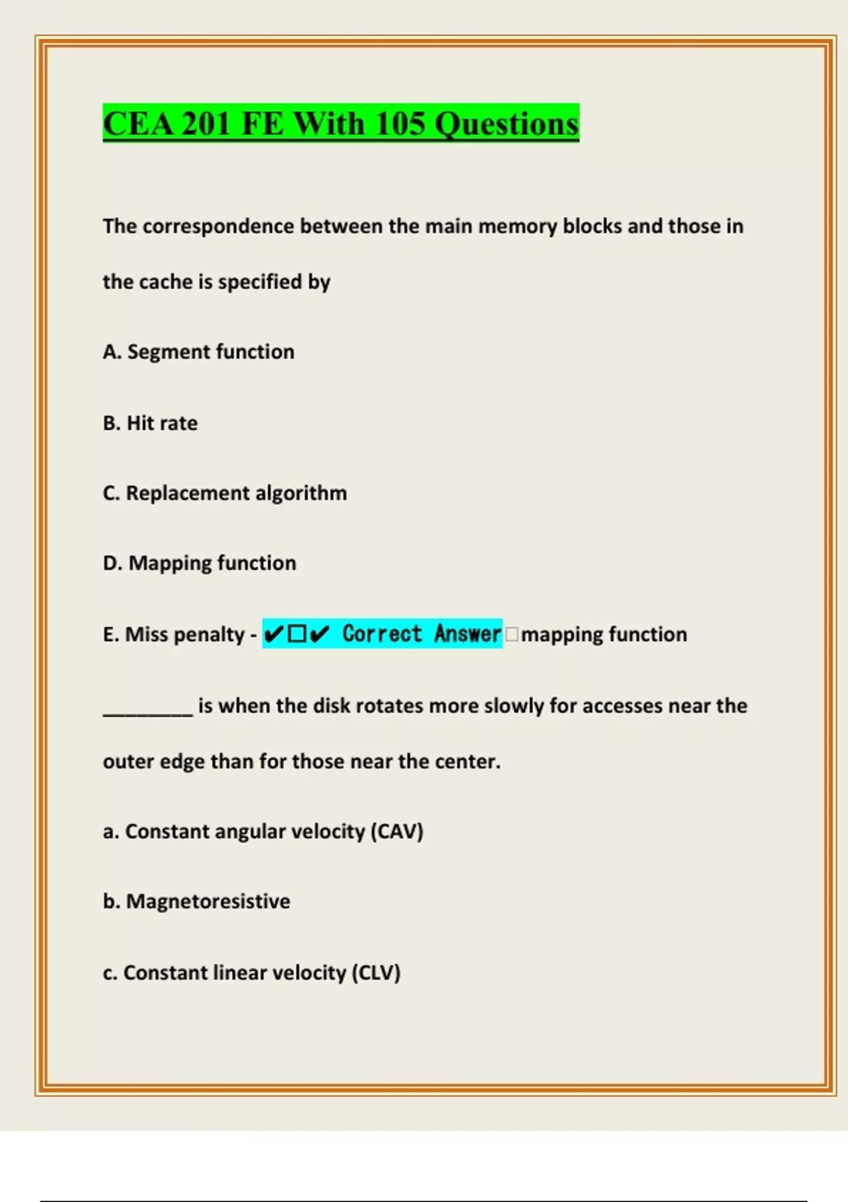 The correspondence between the main memory blocks and those in the cache is specified by A. Segment function B. Hit rate C. Replacement algorithm D. Mapping function E. Miss penalty - ️ Correct Answer mapping function ________ is when the disk rotates more slowly for accesses near the outer edge than for those near the center. a. Constant angular velocity (CAV) b. Magnetoresistive c. Constant linear velocity (CLV)d. Seek time - ️ Correct Answer Constant linear velocity (CLV)