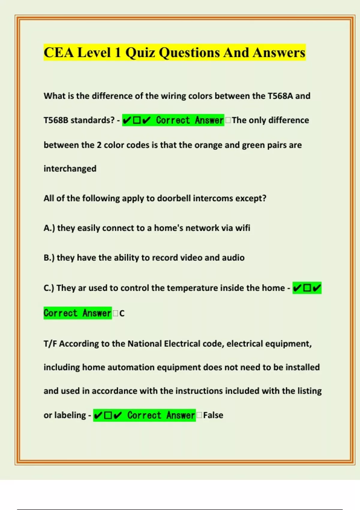 What is the difference of the wiring colors between the T568A and T568B standards? - ️ Correct Answer The only difference between the 2 color codes is that the orange and green pairs are interchanged All of the following apply to doorbell intercoms except? A.) they easily connect to a home's network via wifi B.) they have the ability to record video and audio C.) They ar used to control the temperature inside the home - ️ Correct Answer C T/F According to the National Electrical code, electrical equipment, including home automation equipment does not need to be installed and used in accordance with the instructions included with the listing or labeling - ️ Correct Answer False