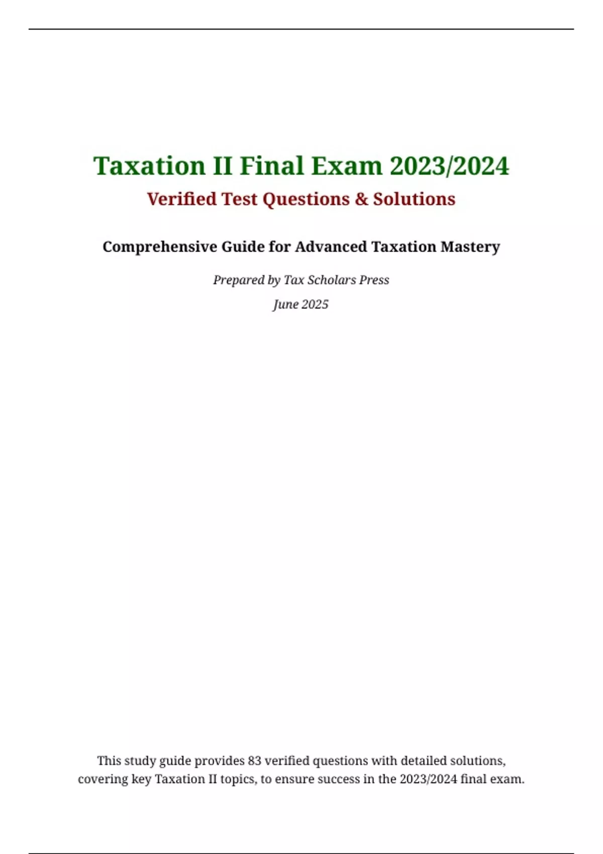 Taxation II Final Exam 2023/2024 Verified Test Questions & Solutions Comprehensive Guide for Advanced Taxation Mastery Prepared by Tax Scholars Press June 2025