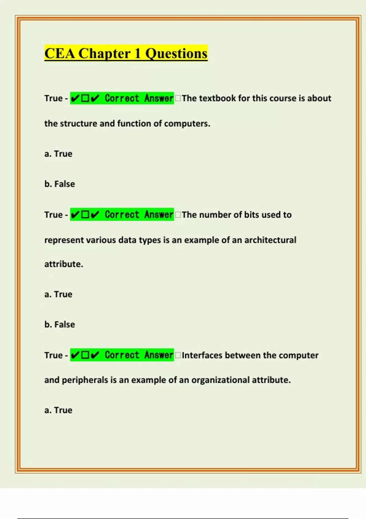 True - ️ Correct Answer The textbook for this course is about the structure and function of computers. a. True b. False True - ️ Correct Answer The number of bits used to represent various data types is an example of an architectural attribute. a. True b. False True - ️ Correct Answer Interfaces between the computer and peripherals is an example of an organizational attribute. a. Trueb. False