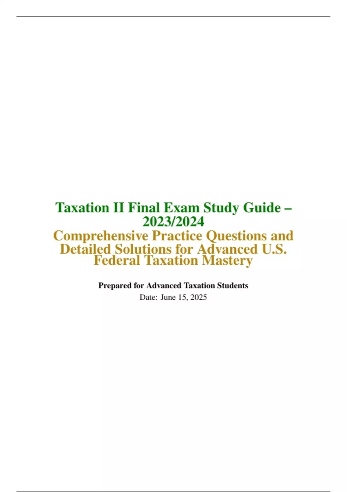 Taxation II Final Exam Study Guide 2023/2024 Comprehensive Practice Questions and Detailed Solutions for Advanced U.S. Federal Taxation Mastery Prepared for Advanced Taxation Students Date: June 15, 2025