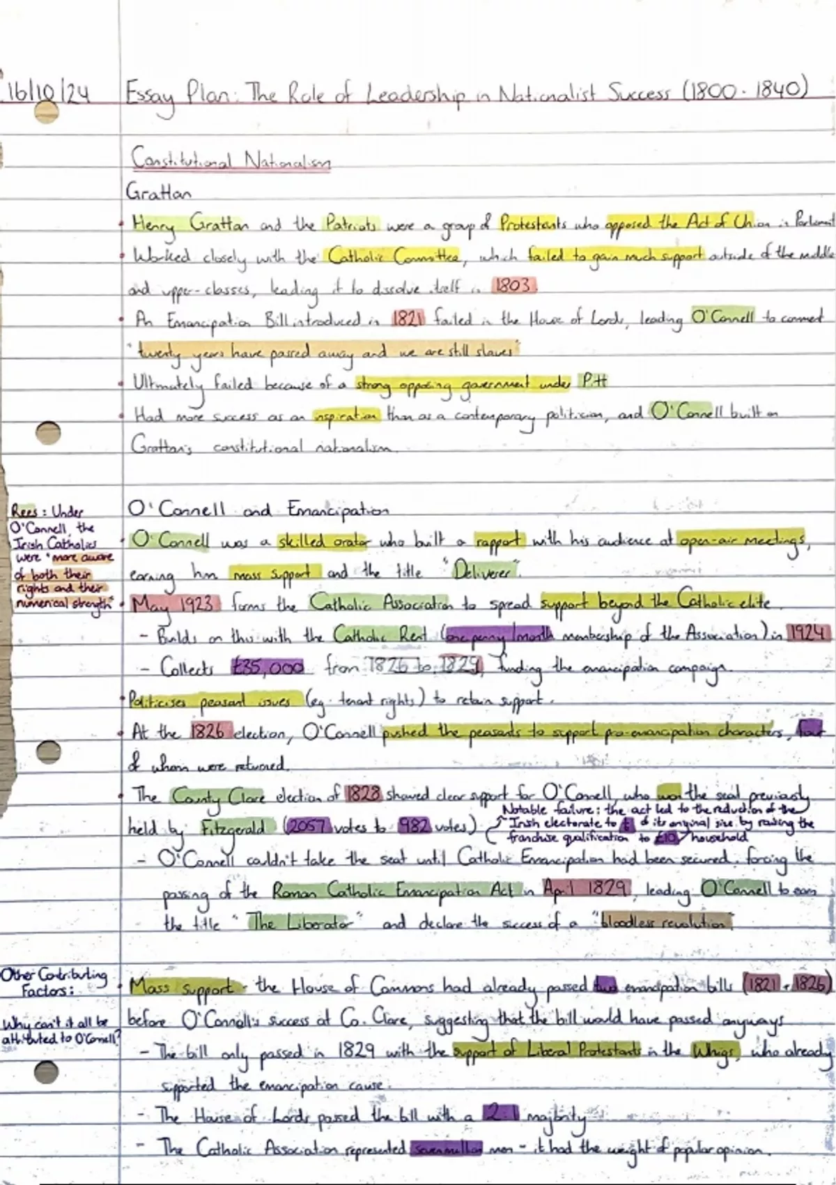 This document includes an essay and a colour-coded essay plan analysing the success of Irish nationalist leadership between 1800 and 1840. This is part of the "Ireland Under the Union " segment of A Level History. Happy studying!