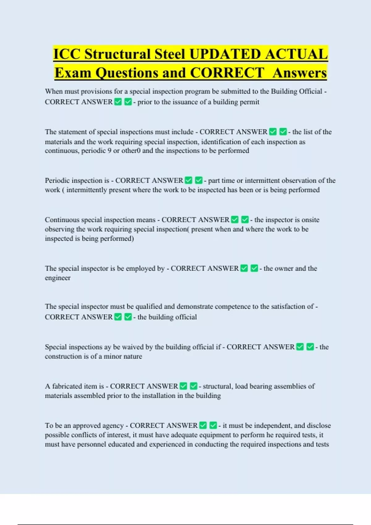 ICC Structural Steel UPDATED ACTUAL Exam Questions and CORRECT Answers When must provisions for a special inspection program be submitted to the Building Official - CORRECT ANSWER - prior to the issuance of a building permit The statement of special inspections must include - CORRECT ANSWER - the list of the materials and the work requiring special inspection, identification of each inspection as continuous, periodic 9 or other0 and the inspections to be performed Periodic inspection is - CORRECT ANSWER - part time or intermittent observation of the work ( intermittently present where the work to be inspected has been or is being performe