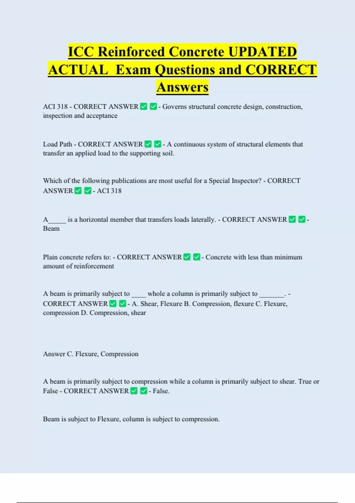 ICC Reinforced Concrete UPDATED ACTUAL Exam Questions and CORRECT Answers ACI 318 - CORRECT ANSWER inspection and acceptance Load Path - CORRECT ANSWER - Governs structural concrete design, construction, - A continuous system of structural elements that transfer an applied load to the supporting soil. Which of the following publications are most useful for a Special Inspector? - CORREC
