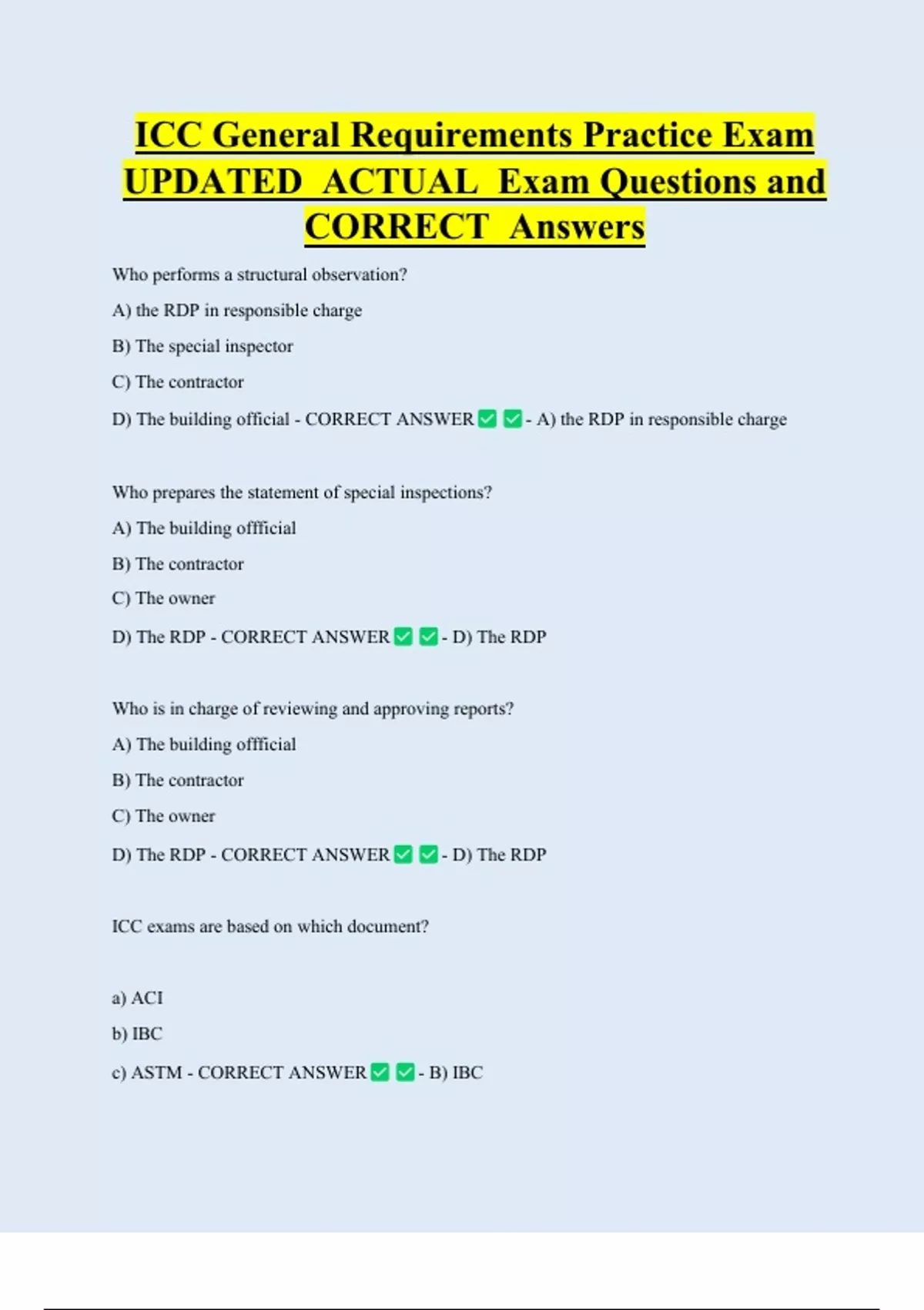 ICC General Requirements Practice Exam UPDATED ACTUAL Exam Questions and CORRECT Answers Who performs a structural observation? A) the RDP in responsible charge B) The special inspector C) The contractor D) The building official - CORRECT ANSWER Who prepares the statement of special inspections? A) The building offficial B) The contractor C) The owner D) The RDP - CORRECT ANSWER Who is in charge of reviewing and approving reports? A) The building offficial B) The contractor C) The owner D) The RDP - CORRECT ANSWER ICC exams are based on which document? a) ACI b) IBC c) ASTM - CORRECT ANSWER - A) the RDP in responsible charge