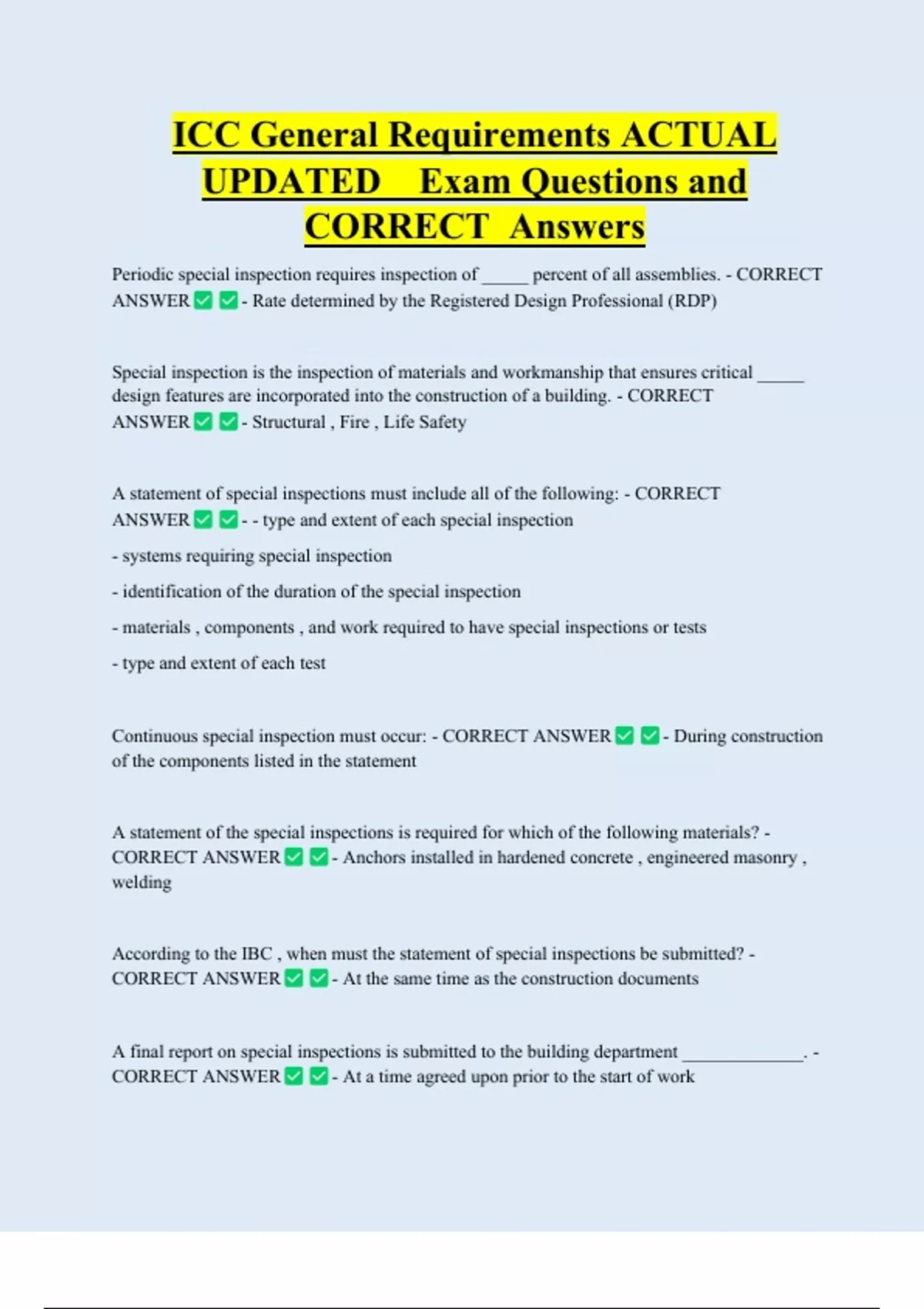 ICC General Requirements ACTUAL UPDATED Exam Questions and CORRECT Answers Periodic special inspection requires inspection of _____ percent of all assemblies. - CORRECT ANSWER - Rate determined by the Registered Design Professional (RDP) Special inspection is the inspection of materials and workmanship that ensures critical _____ design features are incorporated into the construction of a building. - CORRECT ANSWER - Structural , Fire , Life Safety A statement of special inspections must include all of the following: - CORRECT ANSWER - - type and extent of each special inspection