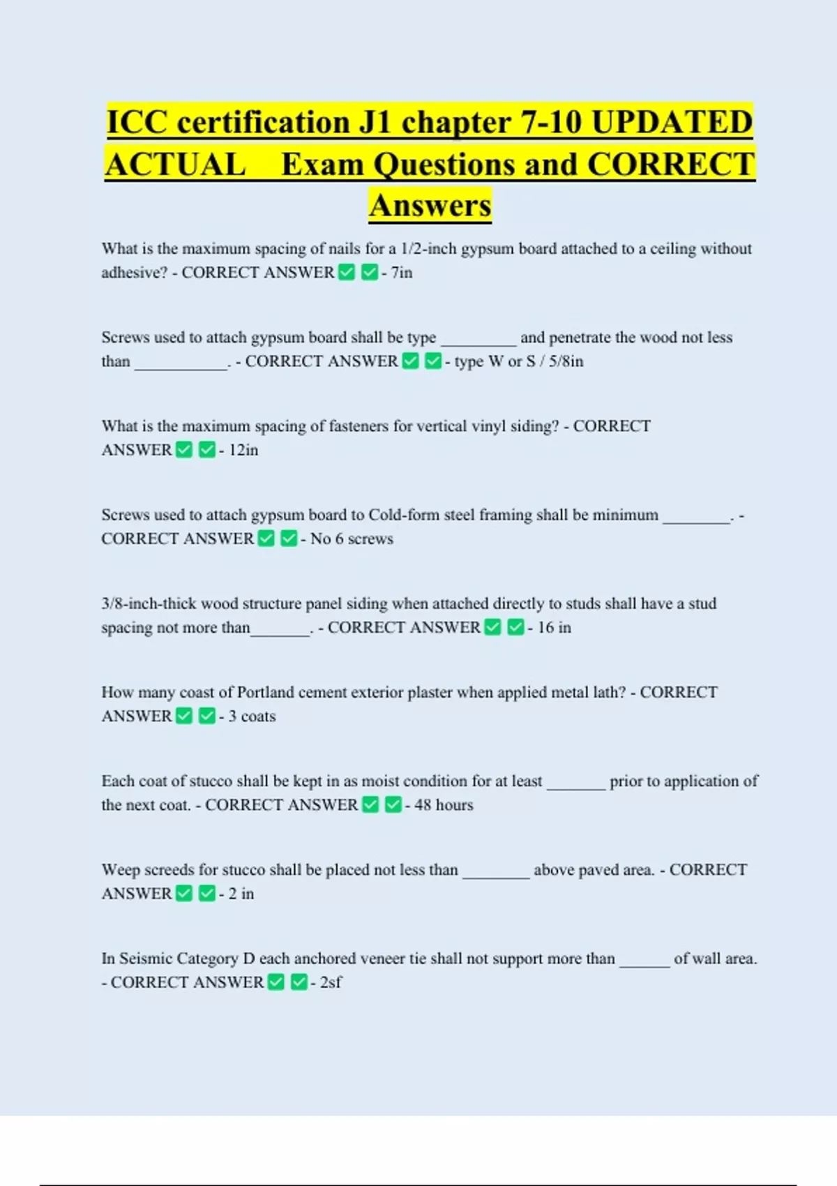 ICC certification J1 chapter 7-10 UPDATED ACTUAL Exam Questions and CORRECT Answers What is the maximum spacing of nails for a 1/2-inch gypsum board attached to a ceiling without adhesive? - CORRECT ANSWER - 7in Screws used to attach gypsum board shall be type _________ and penetrate the wood not less than ___________. - CORRECT ANSWER - type W or S / 5/8in What is the maximum spacing of fasteners for vertical vinyl siding? - CORREC