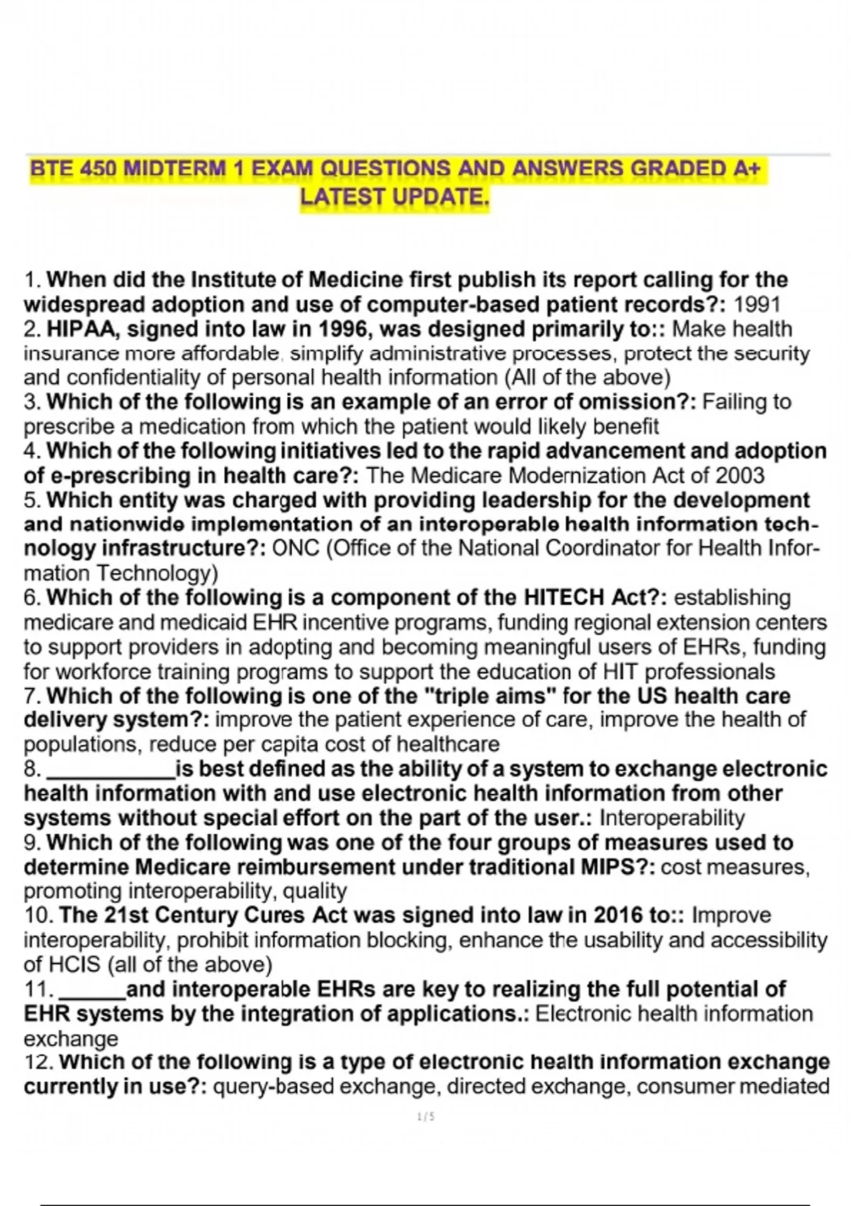 BTE 450 MIDTERM 1 EXAM QUESTIONS AND ANSWERS GRADED A+ LATEST UPDATE.