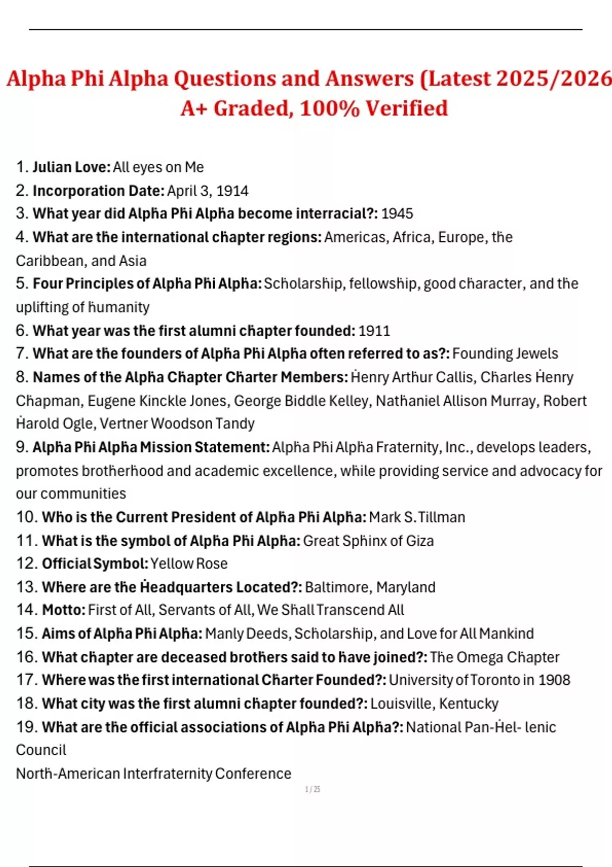 This document includes the most recent and accurate set of Alpha Phi Alpha IMDP questions and answers for the 2025/2026 academic cycle. All content is 100% verified and graded A+, making it a reliable resource for candidates preparing for intake assessments. It covers fraternity history, values, protocols, and key organizational information.