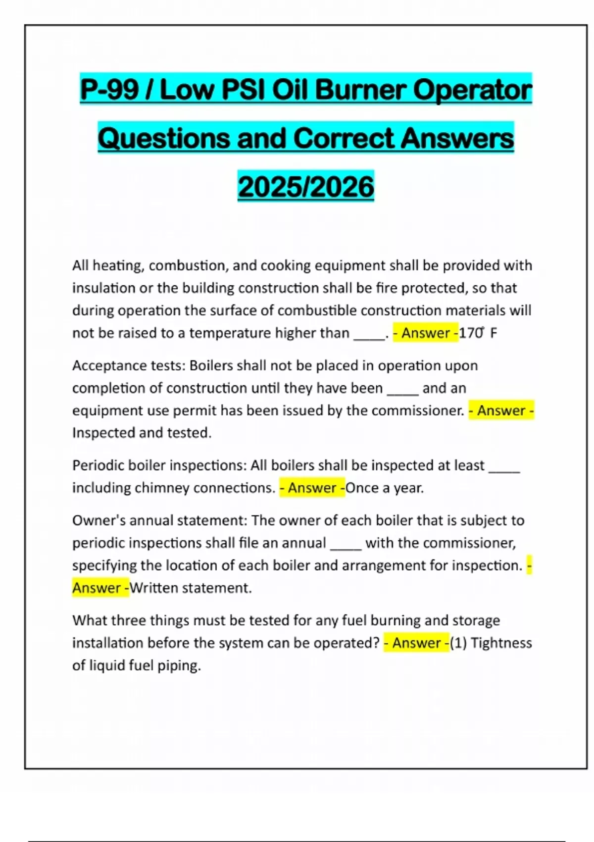 P-99 / Low PSI Oil Burner Operator Questions and Correct Answers 2025/2026 All heating, combustion, and cooking equipment shall be provided with insulation or the building construction shall be fire protected, so that during operation the surface of combustible construction materials will not be raised to a temperature higher than ____. - Answer -170 ̊ F Acceptance tests: Boilers shall not be placed in operation upon completion of construction until they have been ____ and an equipment use permit has been issued by the commissioner. - Answer - Inspected and tested. Periodic boiler inspections: All boilers shall be inspected at least ____ including chimney connections. - Answer -Once a year. Owner's annual statement: The owner of each boiler that is subject to periodic inspections shall file an annual ____ with the commissioner, specifying the location of each boiler and arrangement for inspection. - Answer -Written statement. What three things must be tested for any fuel burning and storage installation before the system can be operated? - Answer -(1) Tightness of liquid fuel piping.(2) Tightness of fuel oil storage tanks. (3) Tightness of gas distribution piping. What are instruction cards for oil burning systems? - Answer -Cards giving complete instructions for care and operation that are permanently located near the equipment. Every oil burning installation that is not fully automatic or requires preheating shall be operated by, or under, the direct supervision of a person holding a ____ issued by the fire commissioner. - Answer -COF After any fuel burning equipment repair for which a licensed operator is required, such operator shall also check the repairs and be ____ while the equipment is started. - Answer -Present. What is abatement of air contaminants? - Answer -Compliance with the air pollution control code. What are the 3 equipment classifications and their temperatures for the products of combustion at the point of leaving the equipment? - Answer -(1) Low Temp: 600° F or less. (2) Medium Temp: 600° - 1000° F. (3) High Temp: 1000° or greater.