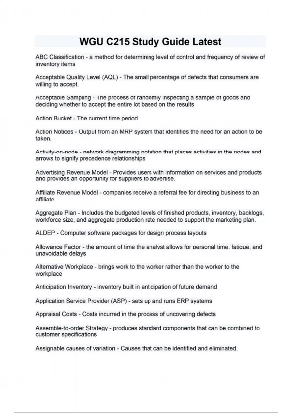 ABC Classification - a method for determining level of control and frequency of review of inventory items Acceptable Quality Level (AQL) - The small percentage of defects that consumers are willing to accept. Acceptable Sampling - The process of randomly inspecting a sample of goods and deciding whether to accept the entire lot based on the results Action Bucket - The current time period Action Notices - Output from an MRP system that identifies the need for an action to be taken. Activity-on-node - network diagramming notation that places activities in the nodes and arrows to signify precedence relationships Advertising Revenue Model - Provides users with information on services and products and provides an opportunity for suppliers to advertise. Affiliate Revenue Model - companies receive a referral fee for directing business to an affiliate Aggregate Plan - Includes the budgeted levels of finished products, inventory, backlogs, workforce size, and aggregate production rate needed to support the marketing plan. ALDEP - Computer software packages for design process layouts Allowance Factor - the amount of time the analyst allows for personal time, fatigue, and unavoidable delays Alternative Workplace - brings work to the worker rather than the worker to the workplace Anticipation Inventory - inventory built in anticipation of future demand Application Service Provider (ASP) - sets up and runs ERP systems Appraisal Costs - Costs incurred in the process of uncovering defects Assemble-to-order Strategy - produces standard components that can be combined to customer specifications Assignable causes of variation - Causes that can be identified and eliminated. Attributes - A product characteristic that has discrete value and can be counted Automated order entry system - A method using telephone models to send digital orders to suppliers Automation - Using machinery to perform work without human operators Average number of jobs in the system - measures work-in-process inventory Average outgoing quality (AOQ) - The expected proportion of defective items that will be passed to the customer under the sampling plan. Back orders - unfilled customer orders Back-order - Delaying delivery to the customer until the item becomes available. Backward integration - Owning or controlling sources of raw materials and components. backward scheduling - scheduling method that determines when the job must be started to be done on the due date Balance Delay - The amount by which the line efficiency falls short of 100 percent. Batch processes - A type of process used to produce a small quantity of products in groups or batches based on customer orders or specifications. Behavioral Feasibility - degree to which the job is intrinsically satisfying to the employee Beliefs that help define JIT Philosophy - Broad view operations, simplicity, continuous improvements, visibility, and flexibility Benchmarking - The process of studying the practices of companies considered 'bestin- class' and comparing your company's performance against theirs. Best operating level - The volume of output that results in the lowest average unit cost. beta probability distribution - typically represents project activities Bill of Material (BOM) - lists all the subassemblies, component parts, and raw materials that go into an end item and shows the usage quantity of each required Block Plan - schematic showing the placement of resources in a facility Bottleneck - Longest Task in the process Bottom-round management - Consensus management by committees or teams break-even analysis - technique used to compute the amount of goods that must be sold just to cover costs Broad view of JIT - a philosophy that encompasses the entire organization Broad view of the organization - Tasks and procedures are important only if they meet the company's overall goals. bullwhip effect - inaccurate or distorted demand information created in the supply chain Business-to-business e-commerce - businesses selling to and buying from other businesses Business-to-consumer e-commerce - on-line businesses sell to individual consumers C-charts - A control chart used to monitor the number of defects per unit Capacity - The maximum output rate that can be achieved by a facility capacity cushion - Additional capacity added to regular capacity requirements to provide greater flexibility. Capacity Planning - the process of establishing the output rate that can be achieved by a facility Capacity Requirements Planning (CRP) - determines the labor and machine resources needed to fill the open and planned orders generated by the MRP Capacity Utilization - Percentage measure of how well available capacity is being used. Capacity-based Options - A group of options that allow the firm to change its current operating capacity. Capacity-constrained Resources - Bottleneck caused by ineffective usage Capital Costs - the higher of the cost of capital or the opportunity cost for the company Cause-and-effect diagram - A chart that identifies potential causes of particular quality problems. Cell Manufacturing - placement of dissimilar machines and equipment together to produce a family of products with similar processing requirements Chase Aggregate Plan - a planning approach that varies production to meet demand each period Checklist - A list of common defects and the number of observed occurrences of these defects. Closed-loop MRP - An MRP system that includes production planning, master production scheduling, and capacity requirements planning Common - Random causes that cannot be identified Components - Raw materials, purchased items, or sub assemblies that are part of a larger assembly computer-aided design (CAD) - A system that uses computer graphics to design new products. computer-integrated manufacturing (CIM) - A term used to describe the integration of product design, process planning, and manufacturing using an integrated computer system. Concurrent Engineering - An approach that b