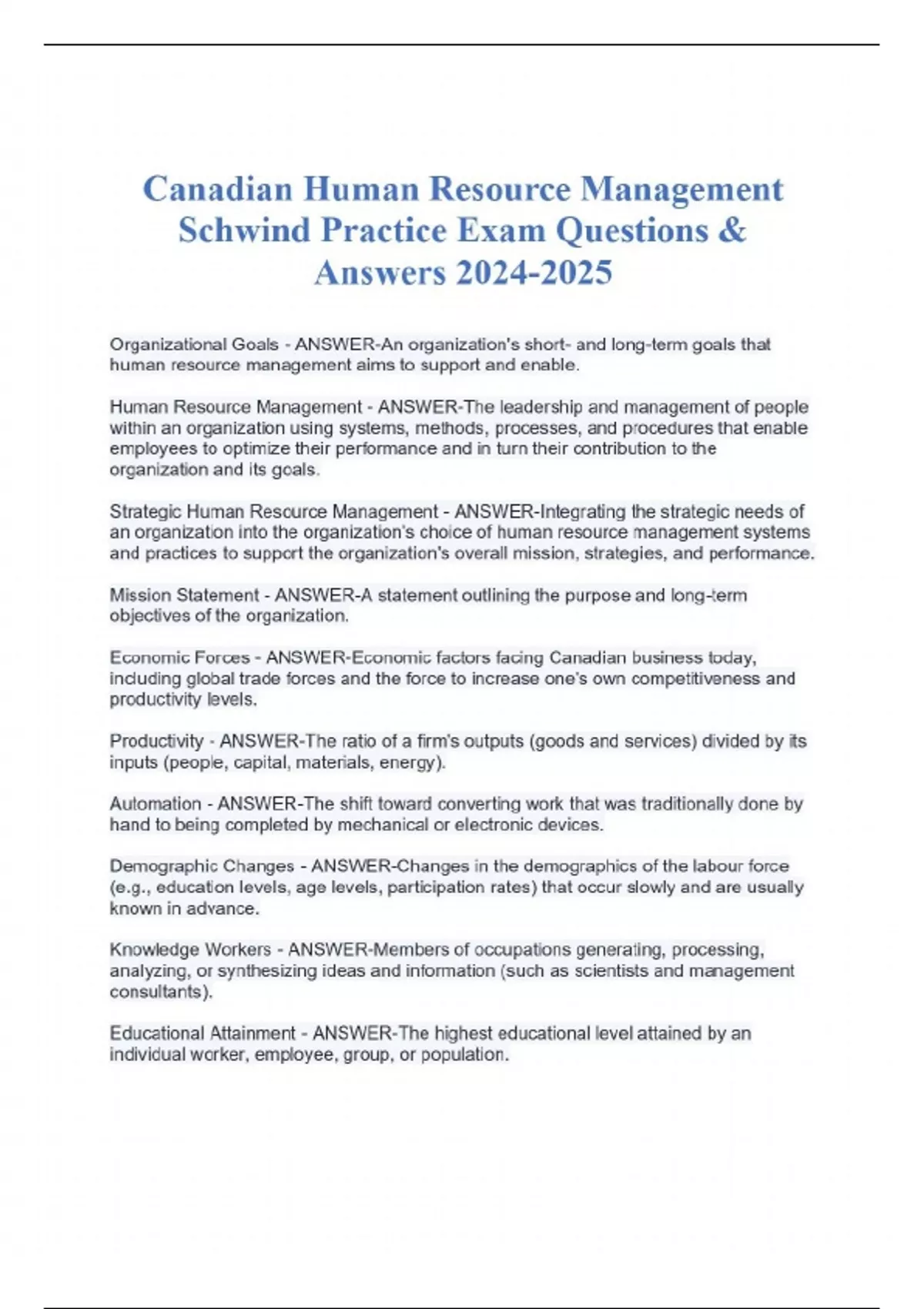 Canadian Human Resource Management Schwind Practice Exam Questions & Answers Organizational Goals - ANSWER-An organization's short- and long-term goals that human resource management aims to support and enable. Human Resource Management - ANSWER-The leadership and management of people within an organization using systems, methods, processes, and procedures that enable employees to optimize their performance and in turn their contribution to the organization and its goals. Strategic Human Resource Management - ANSWER-Integrating the strategic needs of an organization into the organization's choice of human resource management systems and practices to support the organization's overall mission, strategies, and performance. Mission Statement - ANSWER-A statement outlining the purpose and long-term objectives of the organization. Economic Forces - ANSWER-Economic factors facing Canadian business today, including global trade forces and the force to increase one's own competitiveness and productivity levels. Productivity - ANSWER-The ratio of a firm's outputs (goods and services) divided by its inputs (people, capital, materials, energy). Automation - ANSWER-The shift toward converting work that was traditionally done by hand to being completed by mechanical or electronic devices. Demographic Changes - ANSWER-Changes in the demographics of the labour force (e.g., education levels, age levels, participation rates) that occur slowly and are usually known in advance. Knowledge Workers - ANSWER-Members of occupations generating, processing, analyzing, or synthesizing ideas and information (such as scientists and management consultants). Educational Attainment - ANSWER-The highest educational level attained by an individual worker, employee, group, or population. Cultural Mosaic - ANSWER-The Canadian ideal of encouraging each ethnic, racial, and social group to maintain its own cultural heritage, forming a national mosaic of different cultures. Organization Structure - ANSWER-The product of all of an organization's features and how they are arranged- people, objectives, technology, size, age, and policies. Organization Culture - ANSWER-The core beliefs and assumptions that are widely shared be all organizational members. Human Resource Audit - ANSWER-An examination of the human resource policies, practices, and systems of a firm (or division) to eliminate deficiencies and improve ways to achieve goals. Staff Authority - ANSWER-Authority to advise, but not to direct, others. Line Authority - ANSWER-Authority to make decisions about production, performance, and people. Functional Authority - ANSWER-Authority that allows staff experts to make decisions and take actions normally reserved for line managers. Chartered Professionals in Human Resources (CPHR) - ANSWER-Human Resource practitioner, formally accredited to practice, who reflects a threshold professional level of practice. A human resource manager should take corrective actions only after a problem has been crystallized and well understood. - ANSWER-False When assigning jobs to employees, I should ensure that there is no significant variation in job challenges from one employee to the next. - ANSWER-False Two experienced workers and three trainees can complete a project tin 10 days; three experienced workers and two trainees can do the same project in 8 days. If I hire two experienced workers and one trainee, they should be able to complete the project in 11 1/2 days. - ANSWER-False When designing a job application form, I should make sure to ask for applicant's social insurance number in order to complete the employee file. - ANSWER-False When I visit campuses to recruit graduates, I should focus on the quality of education they received in the school rather than on whether they meet specific job requirements. - ANSWER-False When hiring an administrative assistant, the best way to assess the candidate's skills is by requiring the person to undergo a word processing or other performance test. - ANSWER-True The best way to teach a person a new accounting program is to give a short lecture on the subject matter. - ANSWER-False Measuring the student's learning before they begin this course and again at the end of the course may be a better indicator of this course's effectiveness than asking the students about their satisfaction level about what they learned in this course. - ANSWER-True Continues..