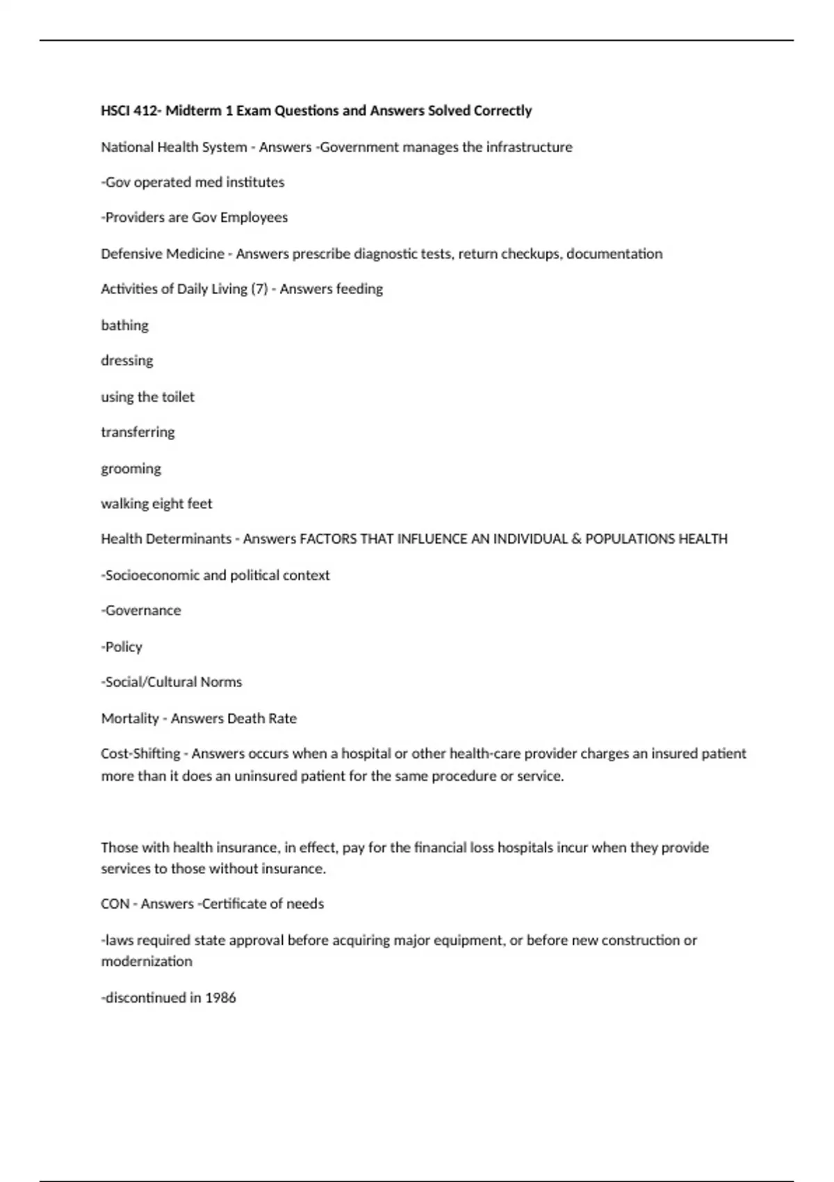 HSCI 412- Midterm 1 Exam Questions and Answers Solved Correctly National Health System - Answers -Government manages the infrastructure -Gov operated med institutes -Providers are Gov Employees Defensive Medicine - Answers prescribe diagnostic tests, return checkups, documentation Activities of Daily Living (7) - Answers feeding bathing dressing using the toilet transferring grooming walking eight feet Health Determinants - Answers FACTORS THAT INFLUENCE AN INDIVIDUAL & POPULATIONS HEALTH -Socioeconomic and political context -Governance -Policy -Social/Cultural Norms Mortality - Answers Death Rate Cost-Shifting - Answers occurs when a hospital or other health-care provider charges an insured patient more than it does an uninsured patient for the same procedure or service. Those with health insurance, in effect, pay for the financial loss hospitals incur when they provide services to those without insurance. CON - Answers -Certificate of needs -laws required state approval before acquiring major equipment, or before new construction or modernization -discontinued in 1986 Maldistribution - Answers Faulty distribution or apportionment, as of resources, over an area or among a group. Efficacy - Answers health benefit from the use of technology Decision Support System - Answers Support managerial and clinical decision making DME - Answers -Durable Medical Equipment - Diffusion - Answers -Spread of technology into society Holistic Health - Answers Focuses on the whole person and how he or she interacts with his or her environment. It emphasizes the connection of mind, body, and spirit. Moral Hazard - Answers When a party gets involved in a risky event.. knowing that it is protected against the risk and the other party will incur the cost. (protected against risk, INSURANCE) Case Mix - Answers -collective severity of conditions -Determined through a comprehensive assessment Morbidity - Answers Disease or disability Social Justice - Answers the view that everyone deserves equal economic, political and social rights and opportunities. Employer Mandate - Answers a requirement that all businesses with 50 or more full-time equivalent employees (FTE) provide health insurance to at least 95% of their full-time employees and dependents up to age 26, or pay a fee by 2016. Bundled Payments - Answers -A number of related services in one price -Reduces provider-induced demand because fees are inclusive of all bundled services -There is evidence that prospectively set bundled fees reduce health care spending without compromising quality of care