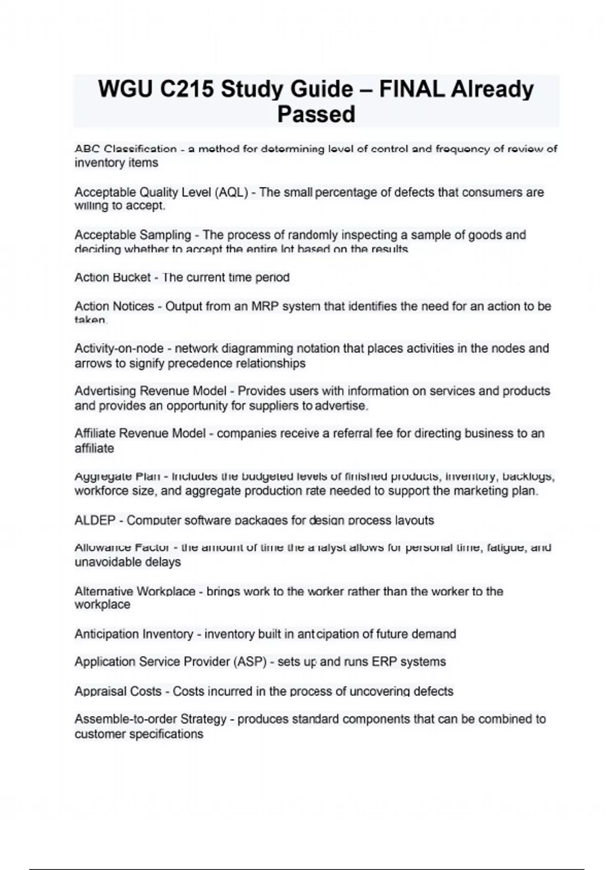 WGU C215 Study Guide – FINAL Already Passed ABC Classification - a method for determining level of control and frequency of review of inventory items Acceptable Quality Level (AQL) - The small percentage of defects that consumers are willing to accept. Acceptable Sampling - The process of randomly inspecting a sample of goods and deciding whether to accept the entire lot based on the results Action Bucket - The current time period Action Notices - Output from an MRP system that identifies the need for an action to be taken. Activity-on-node - network diagramming notation that places activities in the nodes and arrows to signify precedence relationships Advertising Revenue Model - Provides users with information on services and products and provides an opportunity for suppliers to advertise. Affiliate Revenue Model - companies receive a referral fee for directing business to an affiliate Aggregate Plan - Includes the budgeted levels of finished products, inventory, backlogs, workforce size, and aggregate production rate needed to support the marketing plan. ALDEP - Computer software packages for design process layouts Allowance Factor - the amount of time the analyst allows for personal time, fatigue, and unavoidable delays Alternative Workplace - brings work to the worker rather than the worker to the workplace Anticipation Inventory - inventory built in anticipation of future demand Application Service Provider (ASP) - sets up and runs ERP systems Appraisal Costs - Costs incurred in the process of uncovering defects Assemble-to-order Strategy - produces standard components that can be combined to customer specifications Assignable causes of variation - Causes that can be identified and eliminated. Attributes - A product characteristic that has discrete value and can be counted Automated order entry system - A method using telephone models to send digital orders to suppliers Automation - Using machinery to perform work without human operators Average number of jobs in the system - measures work-in-process inventory Average outgoing quality (AOQ) - The expected proportion of defective items that will be passed to the customer under the sampling plan. Back orders - unfilled customer orders Back-order - Delaying delivery to the customer until the item becomes available. Backward integration - Owning or controlling sources of raw materials and components. backward scheduling - scheduling method that determines when the job must be started to be done on the due date Balance Delay - The amount by which the line efficiency falls short of 100 percent. Batch processes - A type of process used to produce a small quantity of products in groups or batches based on customer orders or specifications. Behavioral Feasibility - degree to which the job is intrinsically satisfying to the employee Beliefs that help define JIT Philosophy - Broad view operations, simplicity, continuous improvements, visibility, and flexibility Benchmarking - The process of studying the practices of companies considered 'bestin- class' and comparing your company's performance against theirs. Best operating level - The volume of output that results in the lowest average unit cost. beta probability distribution - typically represents project activities Bill of Material (BOM) - lists all the subassemblies, component parts, and raw materials that go into an end item and shows the usage quantity of each required Block Plan - schematic showing the placement of resources in a facility Bottleneck - Longest Task in the process Bottom-round management - Consensus management by committees or teams break-even analysis - technique used to compute the amount of goods that must be sold just to cover costs Broad view of JIT - a philosophy that encompasses the entire organization Broad view of the organization - Tasks and procedures are important only if they meet the company's overall goals. bullwhip effect - inaccurate or distorted demand information created in the supply chain Business-to-business e-commerce - businesses selling to and buying from other businesses Business-to-consumer e-commerce - on-line businesses sell to individual consumers C-charts - A control chart used to monitor the number of defects per unit Capacity - The maximum output rate that can be achieved by a facility capacity cushion - Additional capacity added to regular capacity requirements to provide greater flexibility. Capacity Planning - the process of establishing the output rate that can be achieved by a facility Capacity Requirements Planning (CRP) - determines the labor and machine resources needed to fill the open and planned orders generated by the MRP Capacity Utilization - Percentage measure of how well available capacity is being used. Capacity-based Options - A group of options that allow the firm to change its current operating capacity. Capacity-constrained Resources - Bottleneck caused by ineffective usage Capital Costs - the higher of the cost of capital or the opportunity cost for the company Cause-and-effect diagram - A chart that identifies potential causes of particular quality problems. Cell Manufacturing - placement of dissimilar machines and equipment together to produce a family of products with similar processing requirements Chase Aggregate Plan - a planning approach that varies production to meet demand each period Checklist - A list of common defects and the number of observed occurrences of these defects. Closed-loop MRP - An MRP system that includes production planning, master production scheduling, and capacity requirements planning Common - Random causes that cannot be identified Components - Raw materials, purchased items, or sub assemblies that are part of a larger assembly computer-aided design (CAD) - A system that uses computer graphics to design new products. computer-integrated manufacturing (CIM) - A term used to describe the integration of product design, process planning, and manufacturing using an integrated computer syste