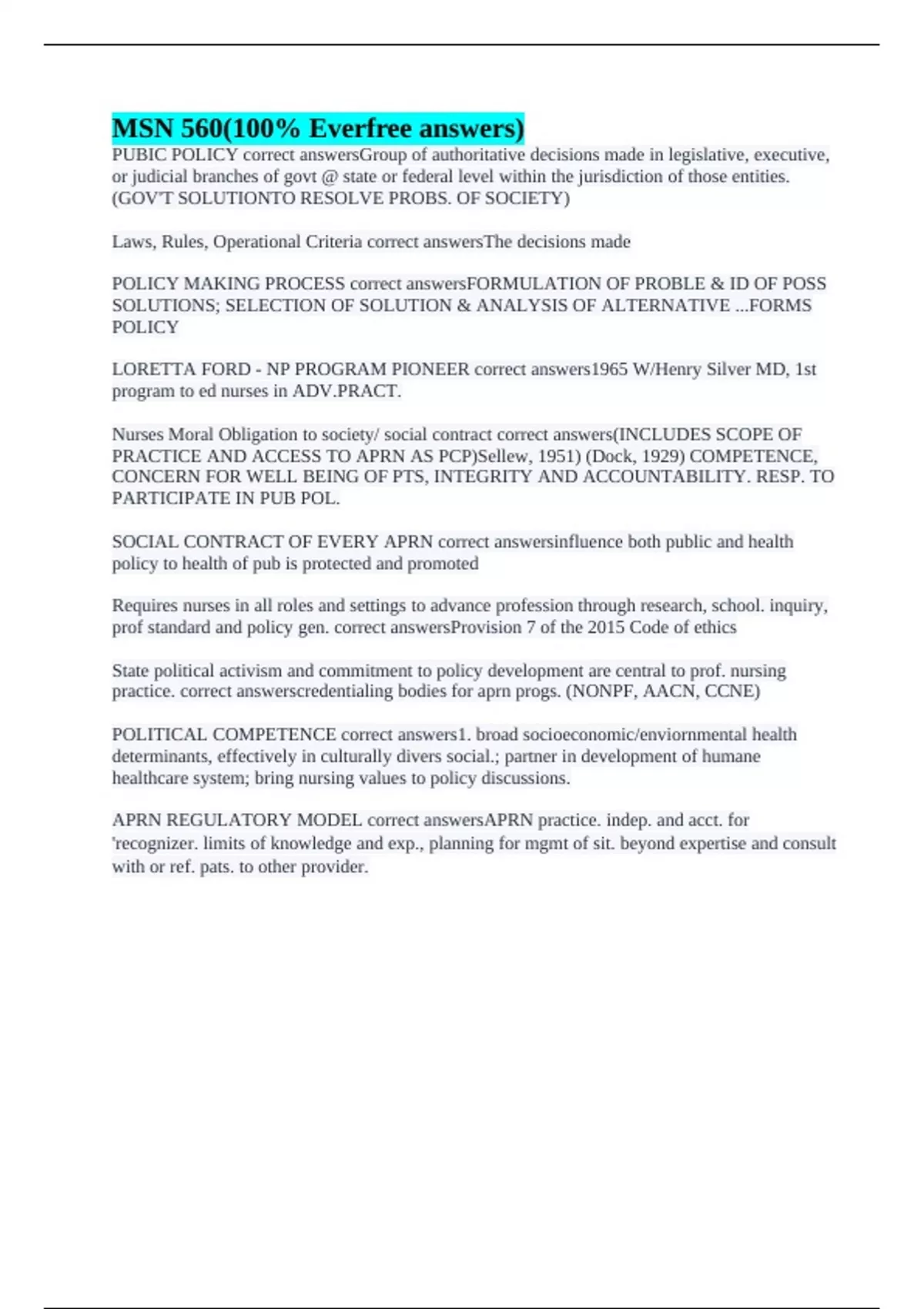 PUBIC POLICY correct answersGroup of authoritative decisions made in legislative, executive, or judicial branches of govt @ state or federal level within the jurisdiction of those entities. (GOV'T SOLUTIONTO RESOLVE PROBS. OF SOCIETY) Laws, Rules, Operational Criteria correct answersThe decisions made POLICY MAKING PROCESS correct answersFORMULATION OF PROBLE & ID OF POSS SOLUTIONS; SELECTION OF SOLUTION & ANALYSIS OF ALTERNATIVE ...FORMS POLICY LORETTA FORD - NP PROGRAM PIONEER correct answers1965 W/Henry Silver MD, 1st program to ed nurses in ADV.PRACT. Nurses Moral Obligation to society/ social contract correct answers(INCLUDES SCOPE OF PRACTICE AND ACCESS TO APRN AS PCP)Sellew, 1951) (Dock, 1929) COMPETENCE, CONCERN FOR WELL BEING OF PTS, INTEGRITY AND ACCOUNTABILITY. RESP. TO PARTICIPATE IN PUB POL. SOCIAL CONTRACT OF EVERY APRN correct answersinfluence both public and health policy to health of pub is protected and promoted Requires nurses in all roles and settings to advance profession through research, school. inquiry, prof standard and policy gen. correct answersProvision 7 of the 2015 Code of ethics State political activism and commitment to policy development are central to prof. nursing practice. correct answerscredentialing bodies for aprn progs. (NONPF, AACN, CCNE) POLITICAL COMPETENCE correct answers1. broad socioeconomic/enviornmental health determinants, effectively in culturally divers social.; partner in development of humane healthcare system; bring nursing values to policy discussions. APRN REGULATORY MODEL correct answersAPRN practice. indep. and acct. for 'recognizer. limits of knowledge and exp., planning for mgmt of sit. beyond expertise and consult with or ref. pats. to other provider.