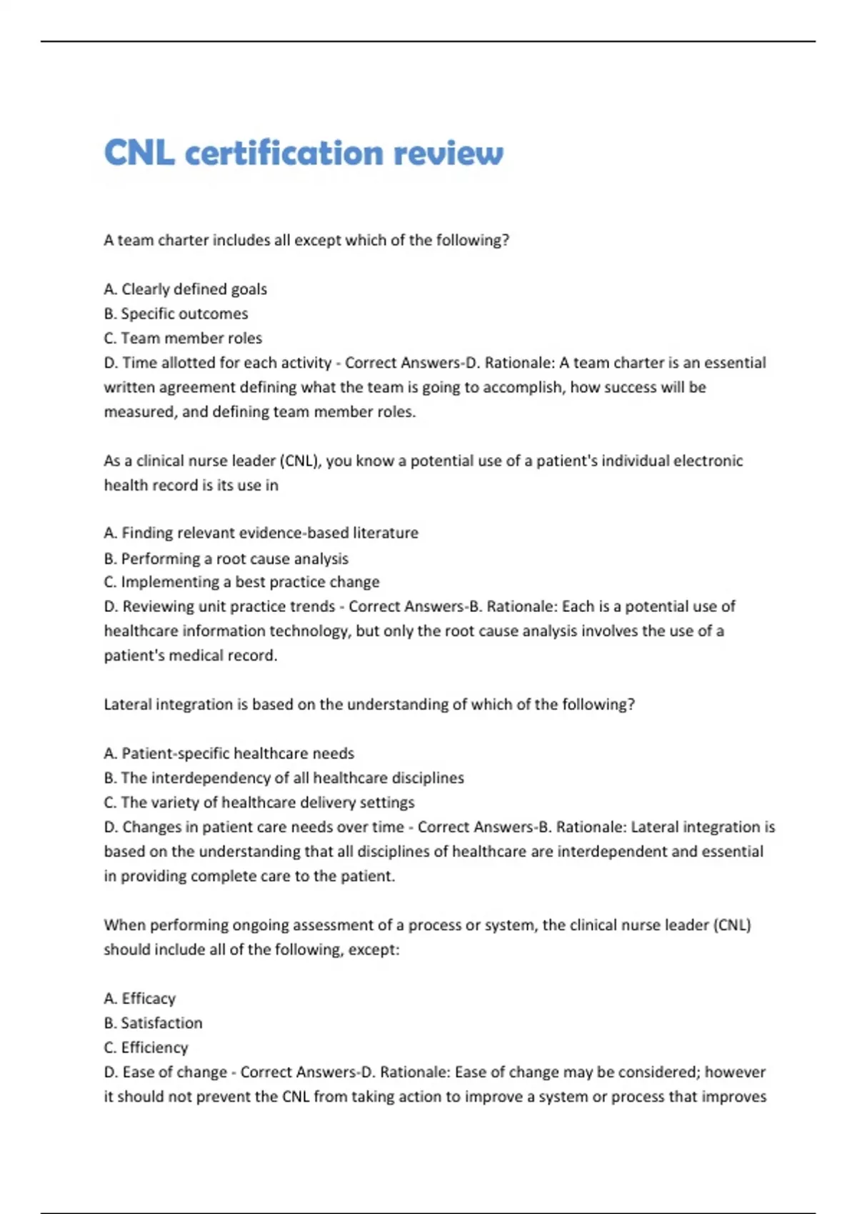D. Reviewing unit practice trends - Correct Answers-B. Rationale: Each is a potential use of