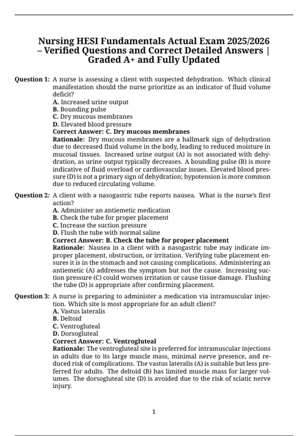 Question 1: A nurse is assessing a client with suspected dehydration. Which clinical