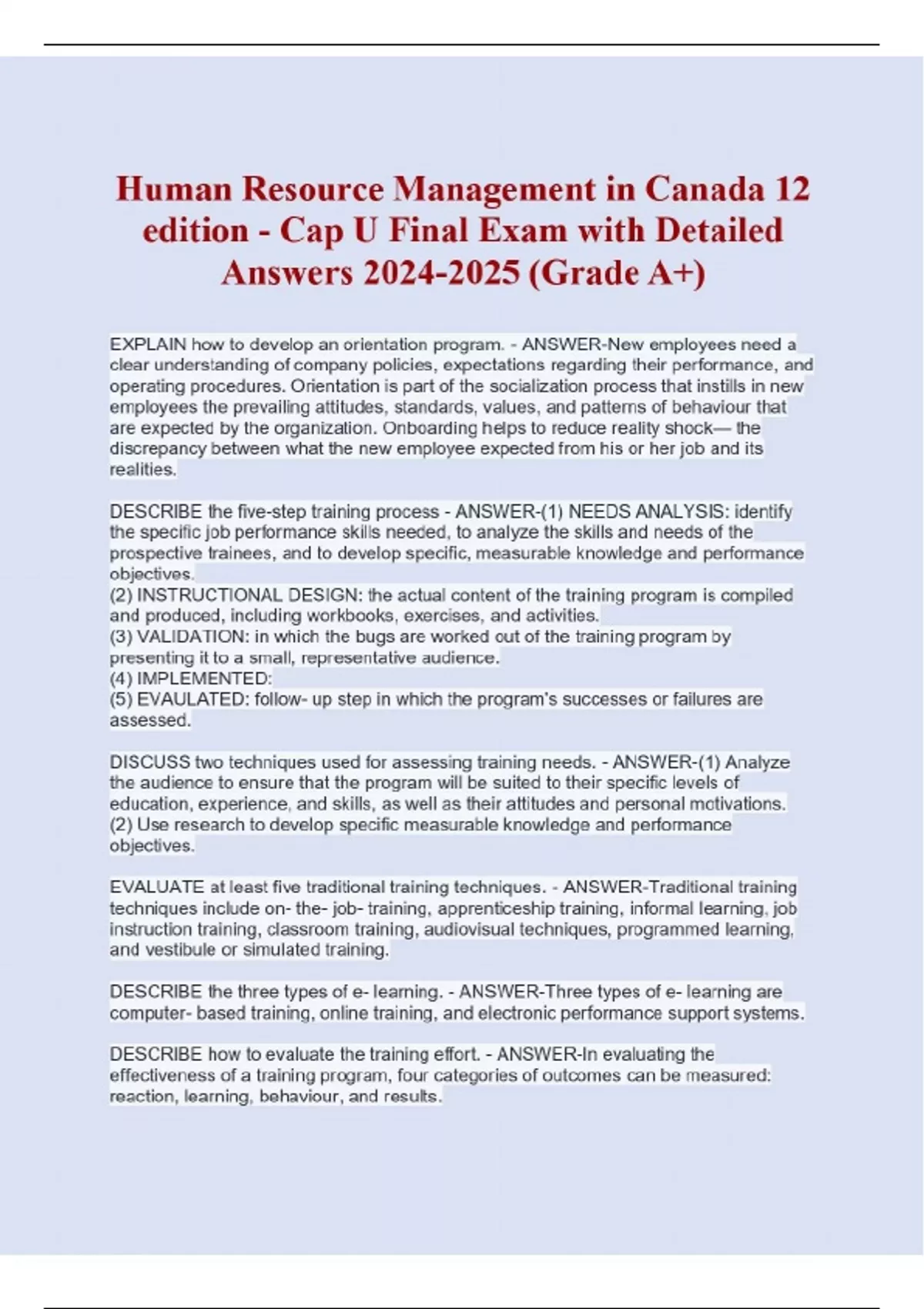 Human Resource Management in Canada 12 edition - Cap U Final Exam with Detailed Answers (Grade A+) EXPLAIN how to develop an orientation program. - ANSWER-New employees need a clear understanding of company policies, expectations regarding their performance, and operating procedures. Orientation is part of the socialization process that instills in new employees the prevailing attitudes, standards, values, and patterns of behaviour that are expected by the organization. Onboarding helps to reduce reality shock— the discrepancy between what the new employee expected from his or her job and its realities. DESCRIBE the five-step training process - ANSWER-(1) NEEDS ANALYSIS: identify the specific job performance skills needed, to analyze the skills and needs of the prospective trainees, and to develop specific, measurable knowledge and performance objectives. (2) INSTRUCTIONAL DESIGN: the actual content of the training program is compiled and produced, including workbooks, exercises, and activities. (3) VALIDATION: in which the bugs are worked out of the training program by presenting it to a small, representative audience. (4) IMPLEMENTED: (5) EVAULATED: follow- up step in which the program's successes or failures are assessed. DISCUSS two techniques used for assessing training needs. - ANSWER-(1) Analyze the audience to ensure that the program will be suited to their specific levels of education, experience, and skills, as well as their attitudes and personal motivations. (2) Use research to develop specific measurable knowledge and performance objectives. EVALUATE at least five traditional training techniques. - ANSWER-Traditional training techniques include on- the- job- training, apprenticeship training, informal learning, job instruction training, classroom training, audiovisual techniques, programmed learning, and vestibule or simulated training. DESCRIBE the three types of e- learning. - ANSWER-Three types of e- learning are computer- based training, online training, and electronic performance support systems. DESCRIBE how to evaluate the training effort. - ANSWER-In evaluating the effectiveness of a training program, four categories of outcomes can be measured: reaction, learning, behaviour, and results. EXPLAIN several common types of training for special purposes. - ANSWER-Today's organizations often provide training for special purposes, including literacy training, diversity training, customer service training, training for teamwork, and training for first- time supervisors/ managers. employee orientation (onboarding) - ANSWER-programs designed to introduce new employees to the job, the people they will be working with and the organization socialization - ANSWER-The ongoing process of instilling in all employees the prevailing attitudes, standards, values, and patterns of behaviour that are expected by the organization. reality shock (cognitive dissonance) - ANSWER-The state that results from the discrepancy between what the new employee expected from his or her new job and the realities of it. CONTINUES...