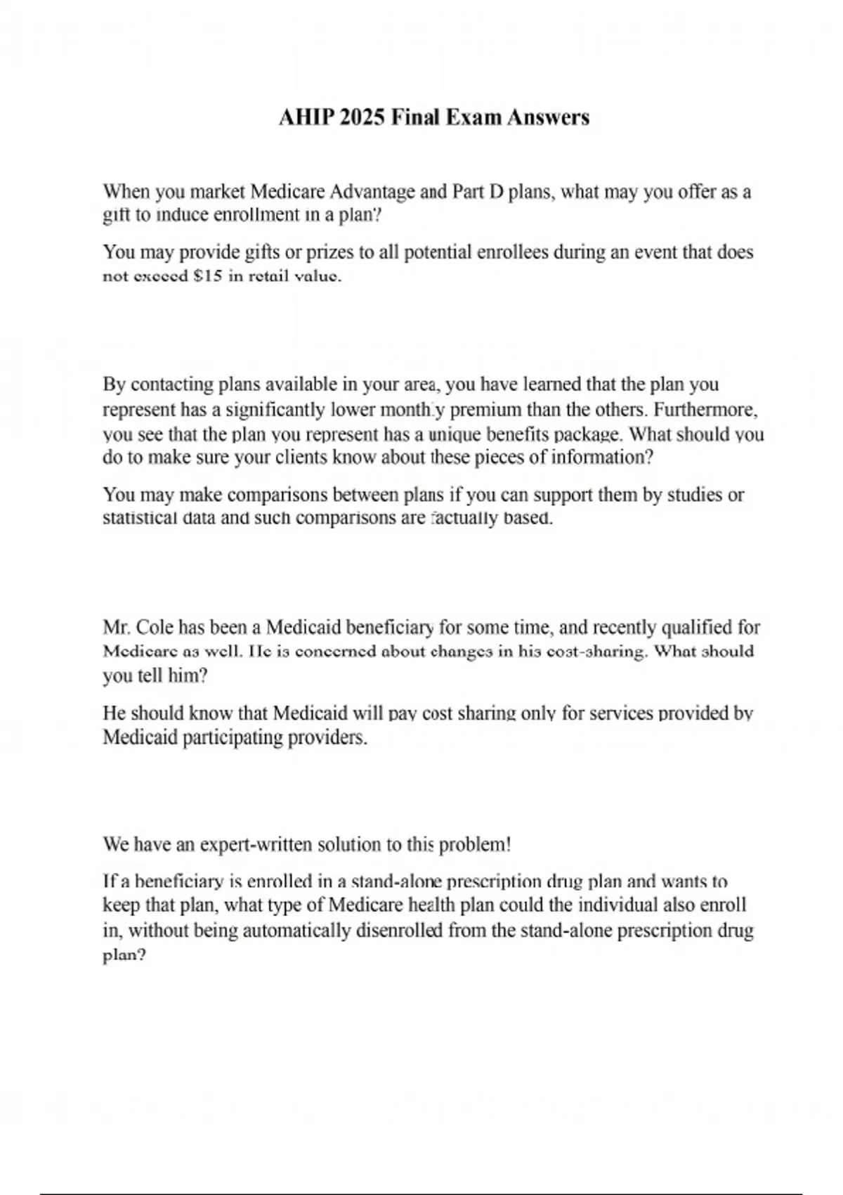 When you market Medicare Advantage and Part D plans, what may you offer as a gift to induce enrollment in a plan? You may provide gifts or prizes to all potential enrollees during an event that does not exceed $15 in retail value. By contacting plans available in your area, you have learned that the plan you represent has a significantly lower monthly premium than the others. Furthermore, you see that the plan you represent has a unique benefits package. What should you do to make sure your clients know about these pieces of information? You may make comparisons between plans if you can support them by studies or statistical data and such comparisons are factually based. Mr. Cole has been a Medicaid beneficiary for some time, and recently qualified for Medicare as well. He is concerned about changes in his cost-sharing. What should you tell him? He should know that Medicaid will pay cost sharing only for services provided by Medicaid participating providers. We have an expert-written solution to this problem! If a beneficiary is enrolled in a stand-alone prescription drug plan and wants to keep that plan, what type of Medicare health plan could the individual also enroll in, without being automatically disenrolled
