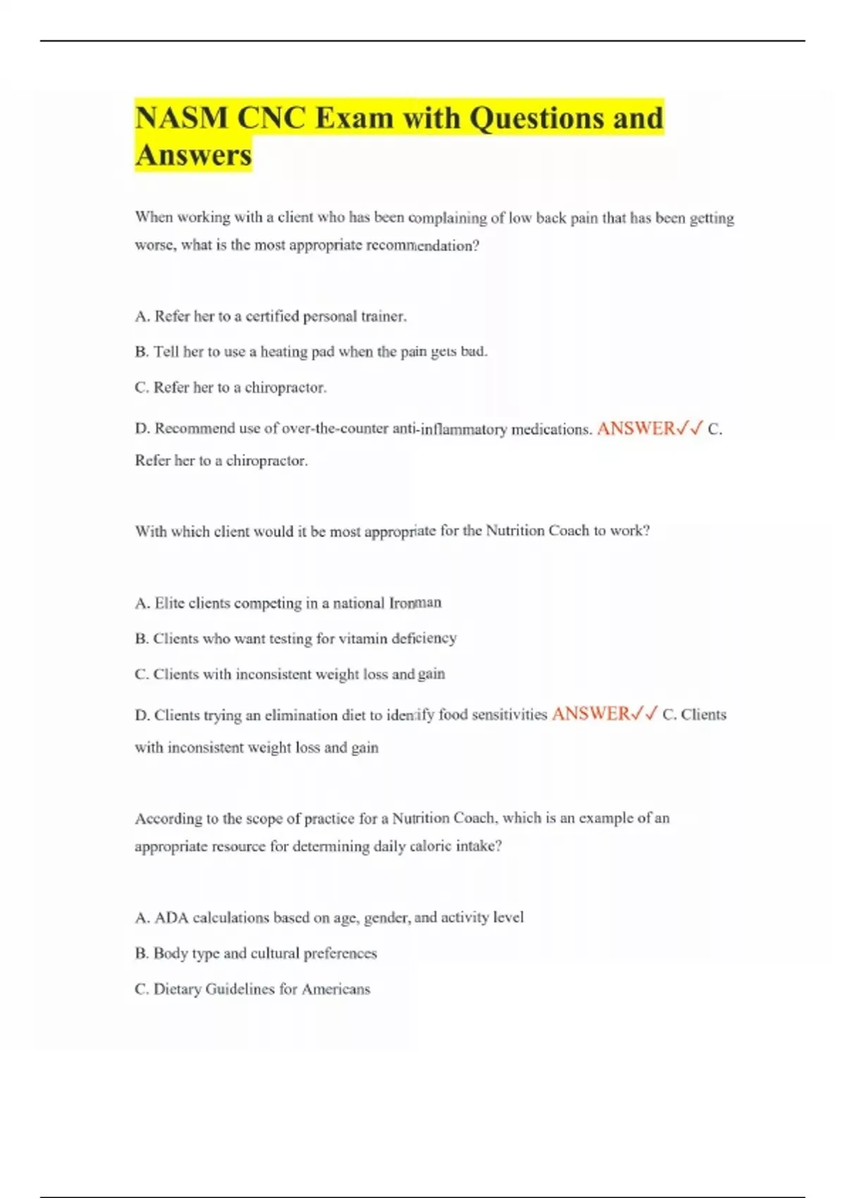 NASM CNC Exam with Questions and Answers When working with a client who has been complaining of low back pain that has been getting worse, what is the most appropriate recommendation? A. Refer her to a certified personal trainer. B. Tell her to use a heating pad when the pain gets bad. C. Refer her to a chiropractor. D. Recommend use of over-the-counter anti-inflammatory medications. ANSWER C. Refer her to a chiropractor. With which client would it be most appropriate for the Nutrition Coach to work? A. Elite clients competing in a national Ironman B. Clients who want testing for vitamin deficiency C. Clients with inconsistent weight loss and gain D. Clients trying an elimination diet to identify food sensitivities ANSWER C. Clients with inconsistent weight loss and gain According to the scope of practice for a Nutrition Coach, which is an example of an appropriate resource for determining daily caloric intake? A. ADA calculations based on age, gender, and activity level B. Body type and cultural preferences C. Dietary Guidelines for Americans