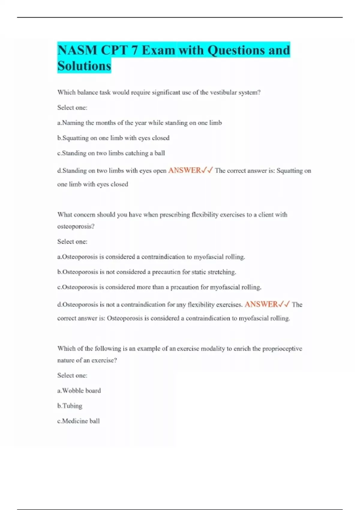 NASM CPT 7 Exam with Questions and Solutions Which balance task would require significant use of the vestibular system? Select one: a.Naming the months of the year while standing on one limb b.Squatting on one limb with eyes closed c.Standing on two limbs catching a ball d.Standing on two limbs with eyes open ANSWER The correct answer is: Squatting on one limb with eyes closed What concern should you have when prescribing flexibility exercises to a client with osteoporosis? Select one: a.Osteoporosis is considered a contraindication to myofascial rolling. b.Osteoporosis is not considered a precaution for static stretching. c.Osteoporosis is considered more than a precaution for myofascial rolling. d.Osteoporosis is not a contraindication for any flexibility exercises. ANSWER The correct answer is: Osteoporosis is considered a contraindication to myofascial rolling. Which of the following is an example of an exercise modality to enrich the proprioceptive nature of an exercise? Select one: a.Wobble board b.Tubing c.Medicine ball