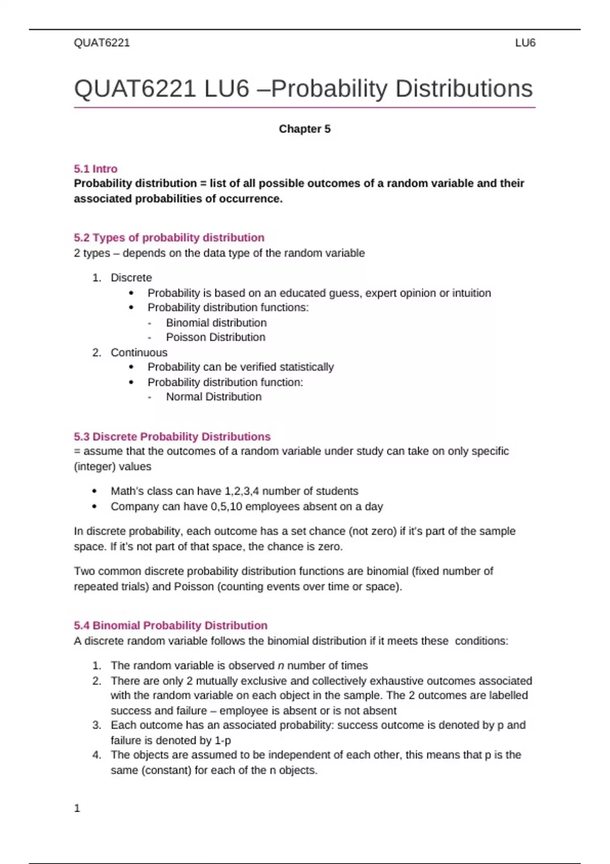 In discrete probability, each outcome has a set chance (not zero) if it’s part of the sample