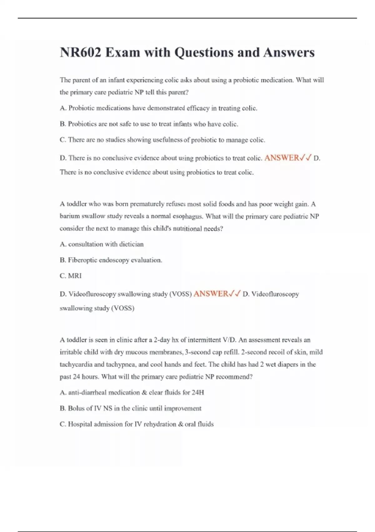 NR602 Exam with Questions and Answers The parent of an infant experiencing colic asks about using a probiotic medication. What will the primary care pediatric NP tell this parent? A. Probiotic medications have demonstrated efficacy in treating colic. B. Probiotics are not safe to use to treat infants who have colic. C. There are no studies showing usefulness of probiotic to manage colic. D. There is no conclusive evidence about using probiotics to treat colic. ANSWER D. There is no conclusive evidence about using probiotics to treat colic. A toddler who was born prematurely refuses most solid foods and has poor weight gain. A barium swallow study reveals a normal esophagus. What will the primary care pediatric NP consider the next to manage this child's nutritional needs? A. consultation with dietician B. Fiberoptic endoscopy evaluation. C. MRI D. Videofluroscopy swallowing study (VOSS) ANSWER D. Videofluroscopy swallowing study (VOSS) A toddler is seen in clinic after a 2-day hx of intermittent V/D. An assessment reveals an irritable child with dry mucous membranes, 3-second cap refill. 2-second recoil of skin, mild tachycardia and tachypnea, and cool hands and feet. The child has had 2 wet diapers in the past 24 hours. What will the primary care pediatric NP recommend? A. anti-diarrheal medication & clear fluids for 24H B. Bolus of IV NS in the clinic until improvement C. Hospital admission for IV rehydration & oral fluids