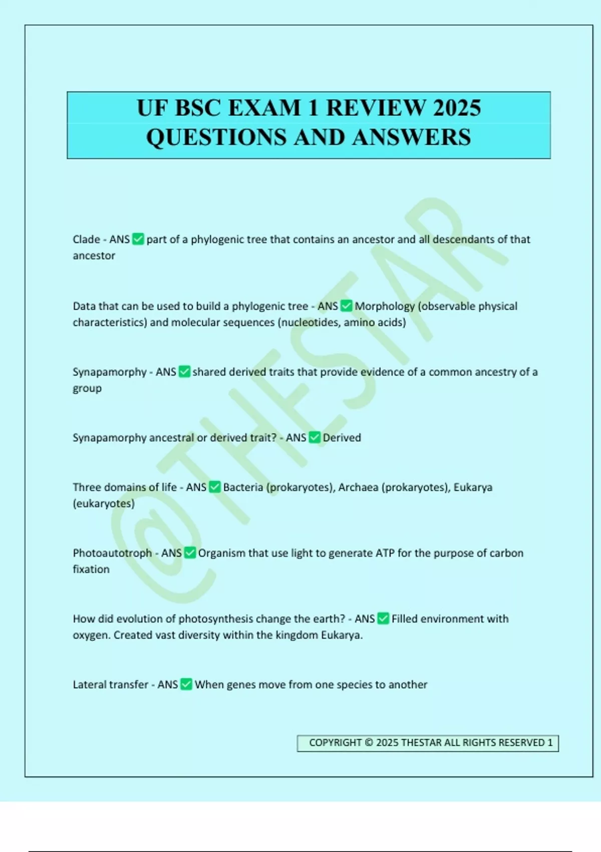 Clade - ANS part of a phylogenic tree that contains an ancestor and all descendants of that ancestor Data that can be used to build a phylogenic tree - ANS Morphology (observable physical characteristics) and molecular sequences (nucleotides, amino acids) Synapamorphy - ANS shared derived traits that provide evidence of a common ancestry of a group Synapamorphy ancestral or derived trait? - ANS Derived Three domains of life - ANS Bacteria (prokaryotes), Archaea (prokaryotes), Eukarya (eukaryotes) Photoautotroph - ANS Organism that use light to generate ATP for the purpose of carbon fixation How did evolution of photosynthesis change the earth? - ANS Filled environment with oxygen. Created vast diversity within the kingdom Eukarya. Lateral transfer - ANS When genes move from one species to another UF BSC EXAM 1 REVIEW 2025 QUESTIONS AND ANSWERS COPYRIGHT © 2025 THESTAR ALL RIGHTS RESERVED 2 Endosymbiosis - ANS When two organisms compliment each other and one of the two organisms lives within the other What organelles did eukaryotes acquire in endosymbiosis? - ANS Mitochondria, chloroplasts Are all photosynthetic eukaryotes plants? - ANS NO!! Dominant form in bryophyte life cycle - ANS Gametophyte Do bryophyte sporophyte and gametophyte live independently? - ANS No, sporophyte is dependent on gametophyte Red algae vs. Green plants - ANS Red algae chlorophyll A only, green algae chlorophyll A and B. Red algae varies from single celled organisms to complex multicellular organisms. Streptophyte Synapamorphies - ANS retention of egg in parental organisms, apical growth, oogamy, plasmodesmata Plasmodesmata - ANS small holes/ channels that make water transport much easier Parenchyma - ANS Basic tissue type in the streptophytes with cells linked by plasmodesmata Land plant synapamorphies - ANS cuticle, stomata, gametangia, embryo, pigments, sporopollenin, mycorrhizae Cuticle - ANS a waxy coating that protects from water loss, disease, sun and organisms who are predators COPYRIGHT © 2025 THESTAR ALL RIGHTS RESERVED 3 Stomata - ANS small openings that allow for gas exchange in air while minimizing water loss Sporopollenin - ANS protective coating for spores Mycorrhizae plants - ANS Plants that have mutually beneficial association with fungi, fungi attach to plant roots and increase surface area of roots allowing for more water to be taken up throught the plant Groups of plants within the bryophytes - ANS liverworts, horntails and mosses Are bryophytes a clade? - ANS NO! Primary characteristics of bryophytes - ANS no vascular system, very small, no structure to keep them off the ground, no structure to transfer food and water through the plant Why do bryophytes tend to live in moist habitats? - ANS bryophytes move nutrients through diffusion and osmosis so they have to be near water to survive Dominant form in the bryophyte life cycle - ANS Gametophyte Can bryophyte sporophytes and gametophytes live indepedently? - ANS No. Sporophyte is physiologically dependent on the gametophyte. Where are bryophyte gametes produced? - ANS Archegonium (female sex organ) and antheridium (male se