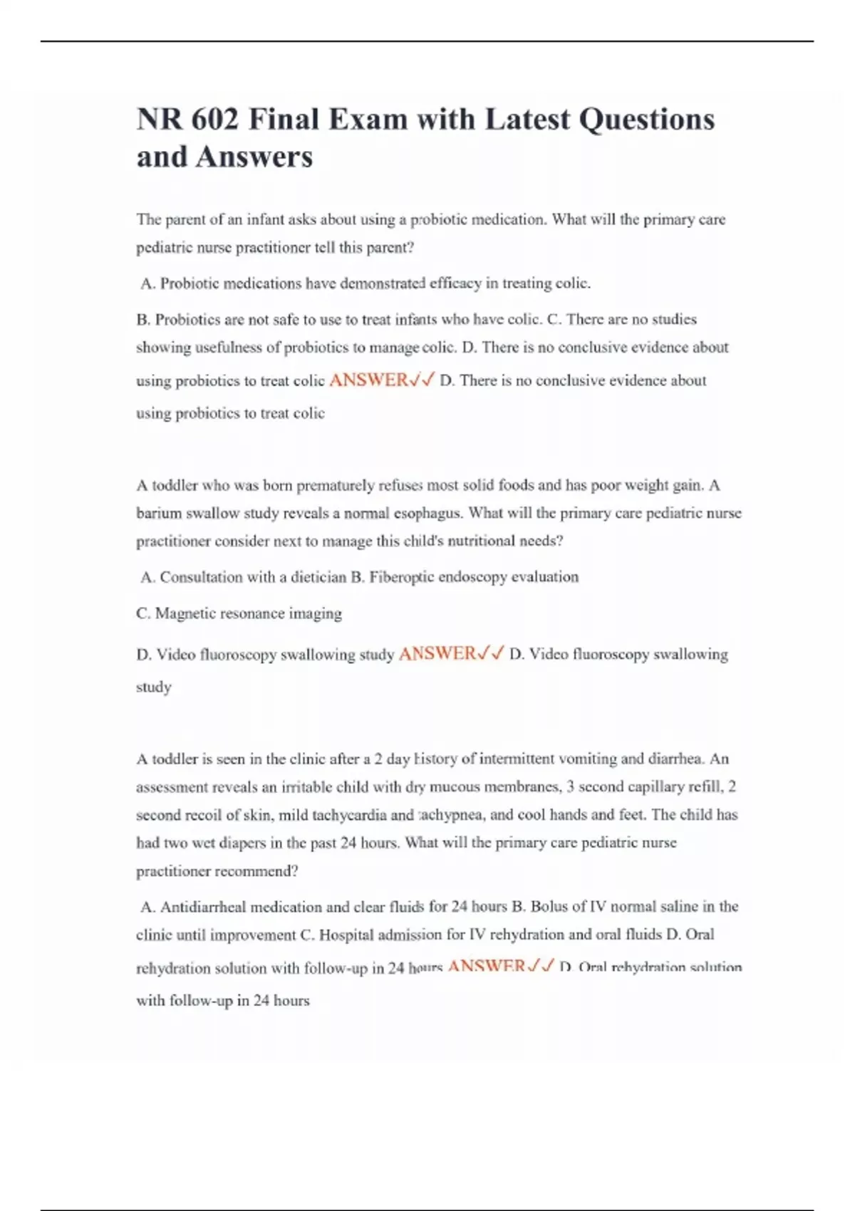 NR 602 Final Exam with Latest Questions and Answers The parent of an infant asks about using a probiotic medication. What will the primary care pediatric nurse practitioner tell this parent? A. Probiotic medications have demonstrated efficacy in treating colic. B. Probiotics are not safe to use to treat infants who have colic. C. There are no studies showing usefulness of probiotics to manage colic. D. There is no conclusive evidence about using probiotics to treat colic ANSWER D. There is no conclusive evidence about using probiotics to treat colic A toddler who was born prematurely refuses most solid foods and has poor weight gain. A barium swallow study reveals a normal esophagus. What will the primary care pediatric nurse practitioner consider next to manage this child's nutritional needs? A. Consultation with a dietician B. Fiberoptic endoscopy evaluation C. Magnetic resonance imaging D. Video fluoroscopy swallowing study ANSWER D. Video fluoroscopy swallowing study A toddler is seen in the clinic after a 2 day history of intermittent vomiting and diarrhea. An assessment reveals an irritable child with dry mucous membranes, 3 second capillary refill, 2 second recoil of skin, mild tachycardia and tachypnea, and cool hands and feet. The child has had two wet diapers in the past 24 hours. What will the primary care pediatric nurse practitioner recommend? A. Antidiarrheal medication and clear fluids for 24 hours B. Bolus of IV normal saline in the clinic until improvement C. Hospital admission for IV rehydration and oral fluids D. Oral rehydration solution with follow-up in 24 hours ANSWER D. Oral rehydration solution with follow-up in 24 hours