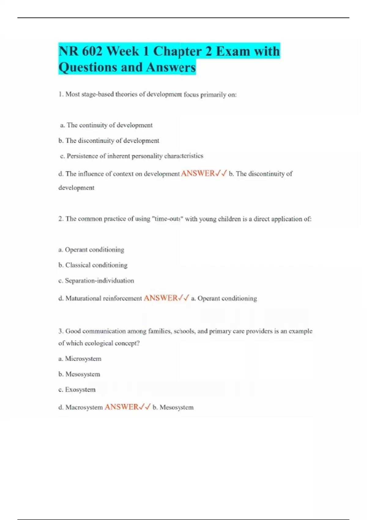 NR 602 Week 1 Chapter 2 Exam with Questions and Answers 1. Most stage-based theories of development focus primarily on: a. The continuity of development b. The discontinuity of development c. Persistence of inherent personality characteristics d. The influence of context on development ANSWER b. The discontinuity of development 2. The common practice of using "time-outs" with young children is a direct application of: a. Operant conditioning b. Classical conditioning c. Separation-individuation d. Maturational reinforcement ANSWER a. Operant conditioning 3. Good communication among families, schools, and primary care providers is an example of which ecological concept? a. Microsystem b. Mesosystem c. Exosystem d. Macrosystem ANSWER b. Mesosystem