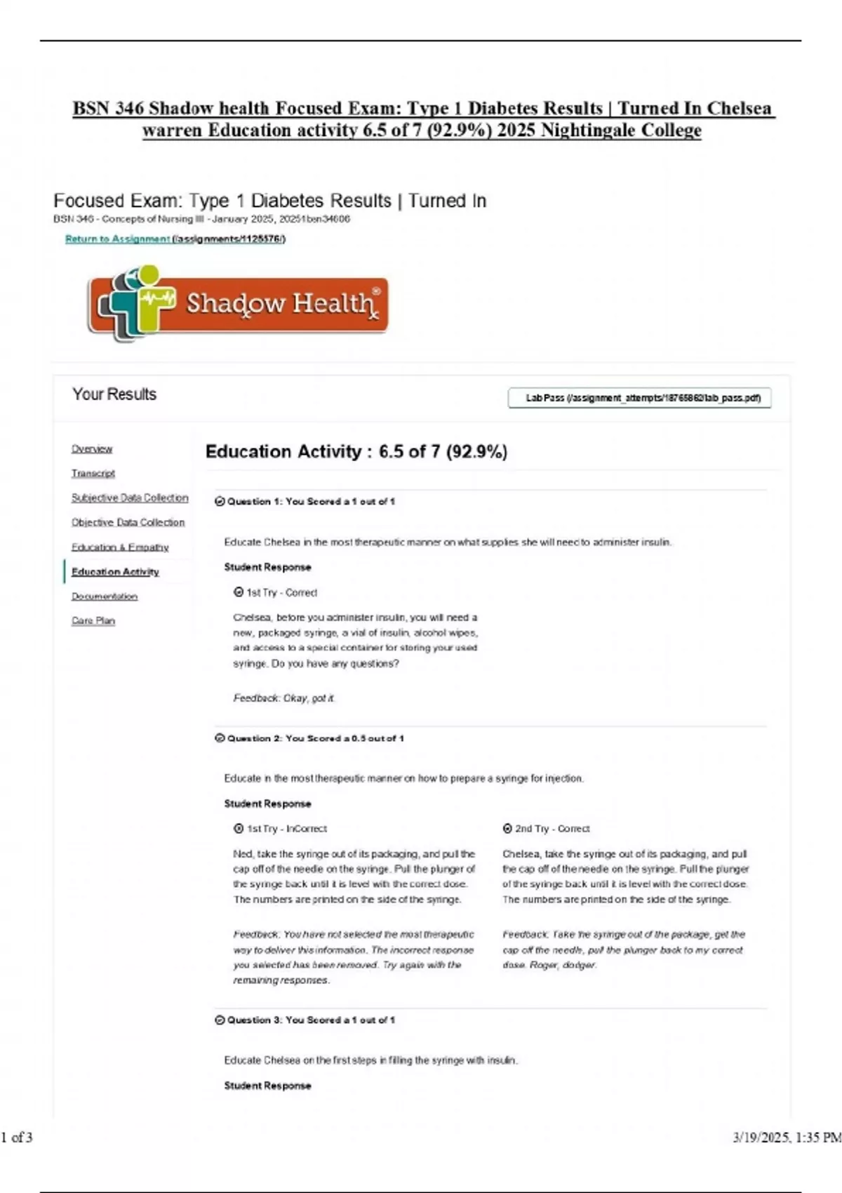 BSN 346 Shadow health Focused Exam: Type 1 Diabetes Results | Turned In Chelsea warren Education activity 6.5 of 7 (92.9%) 2025 Nightingale College