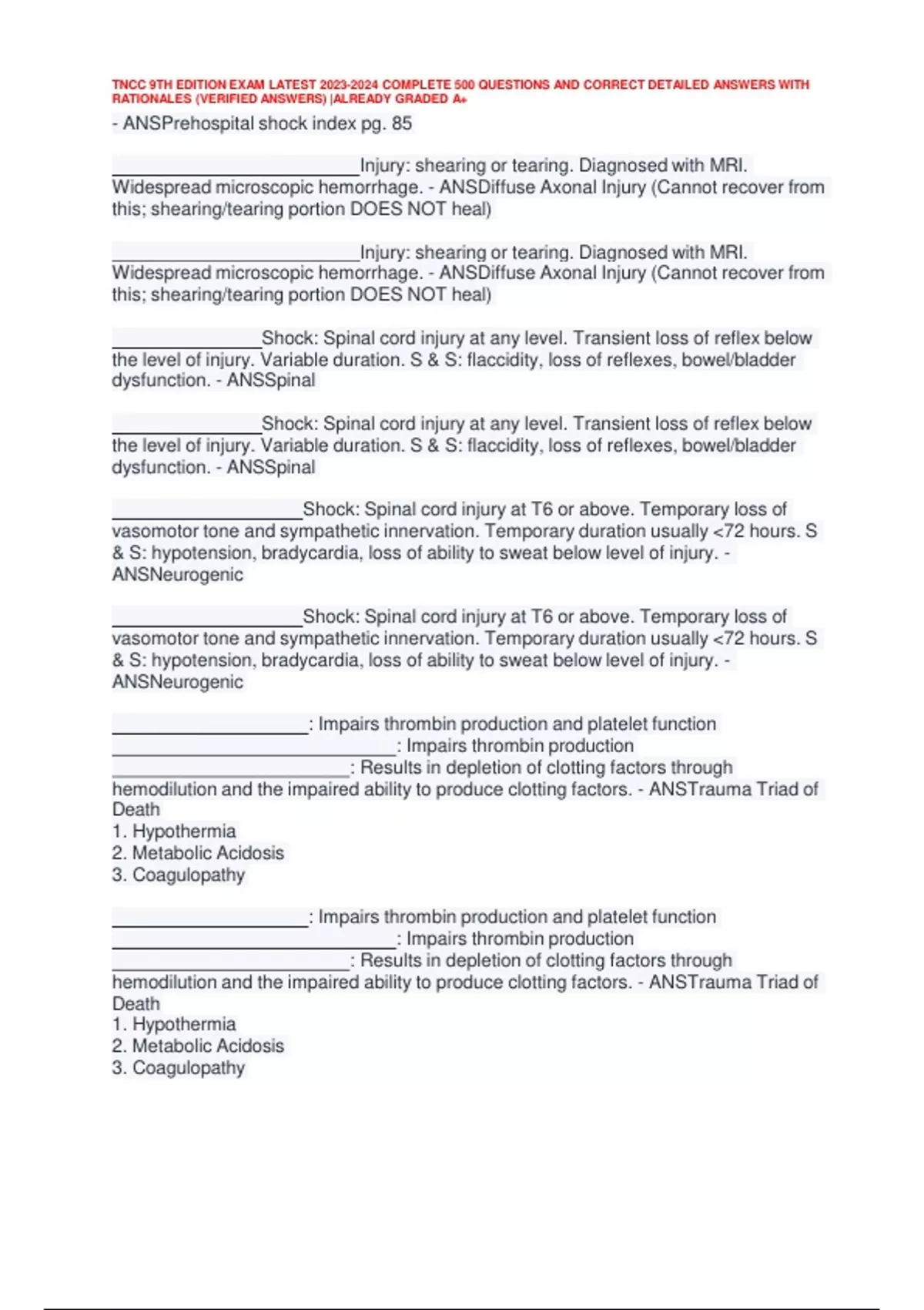 , TNCC 9TH EDITION EXAM LATEST 2023-2024 COMPLETE 500 QUESTIONS AND CORRECT DETAILED ANSWERS WITH