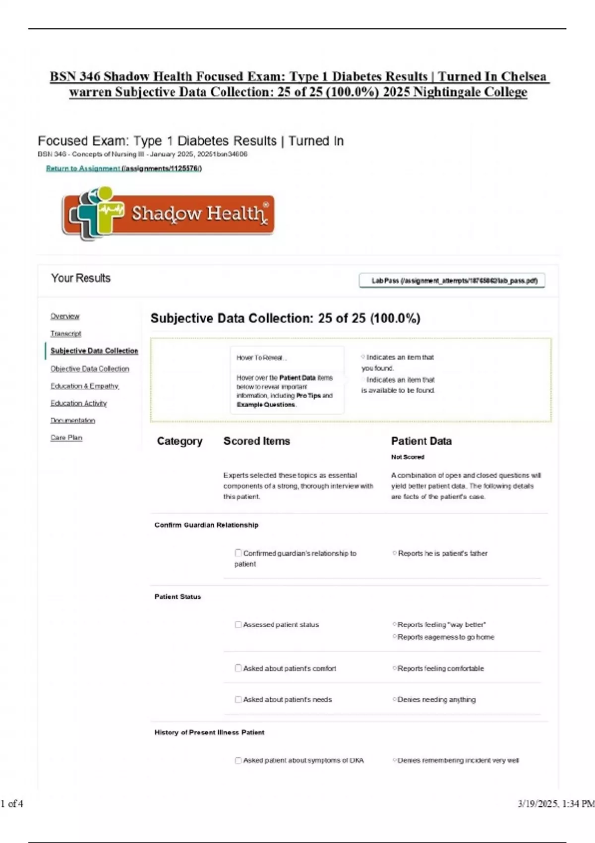 BSN 346 Shadow Health Focused Exam: Type 1 Diabetes Results | Turned In Chelsea warren Subjective Data Collection: 25 of 25 (100.0%) 2025 Nightingale College